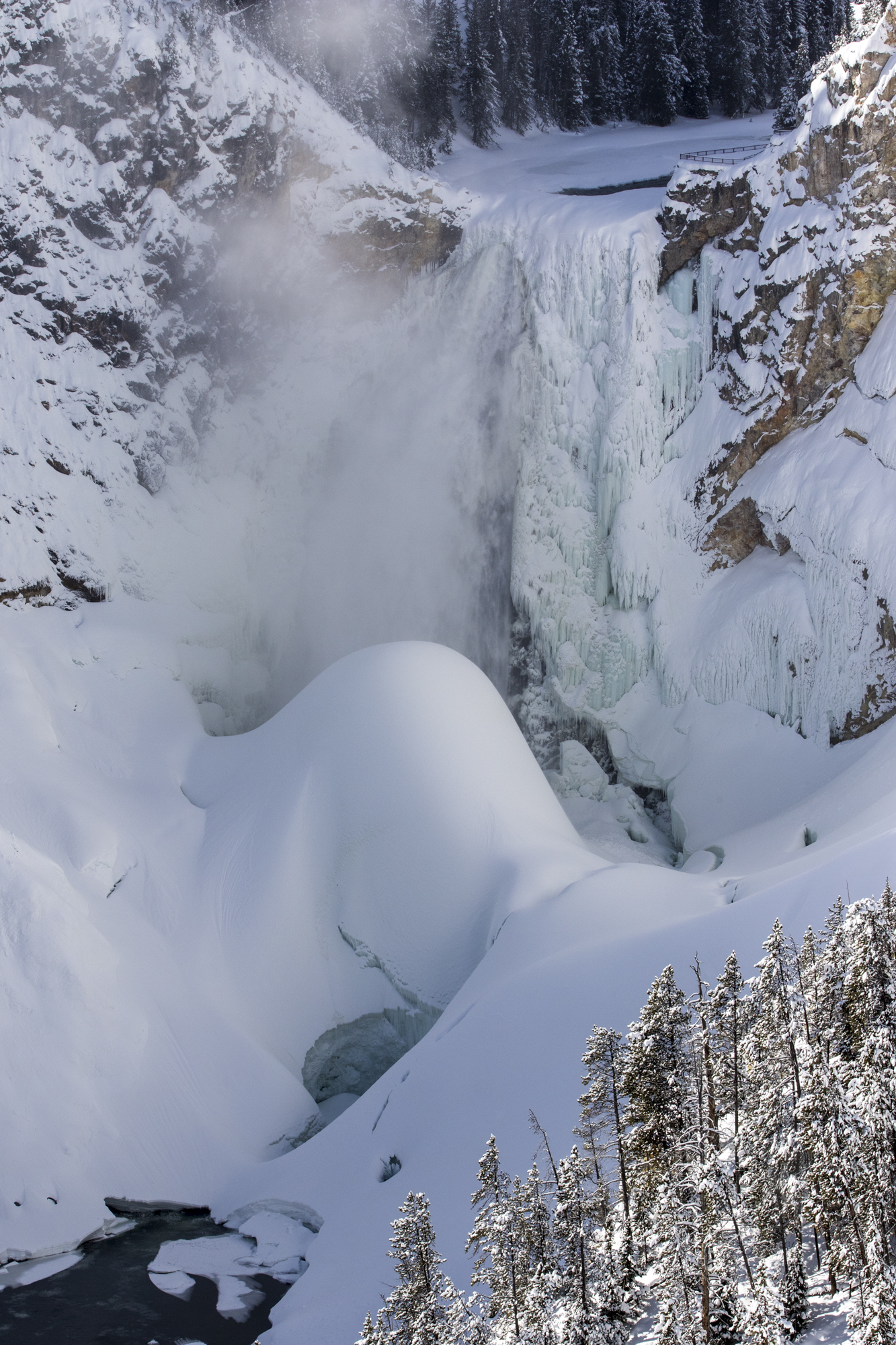 If you take a closer look at Lower Falls in winter, you notice a huge dome-shaped mound in front of the falls. This is “ice mountain”, a large pile of frozen mist, water, and snow that accumulates every winter at the base of the falls, sometimes reaching heights of well over a hundred feet. One source I read said that it tends to vanish quickly in the spring, often collapsing on itself in just a few hours as temperatures warm.