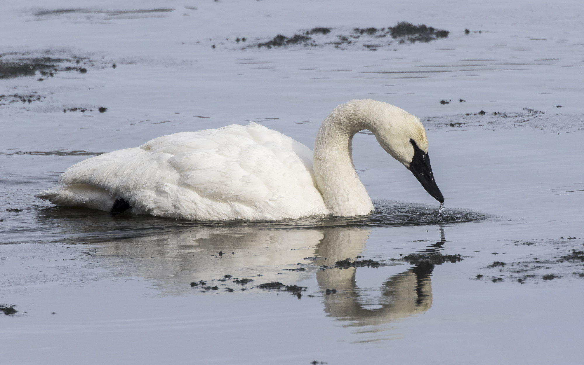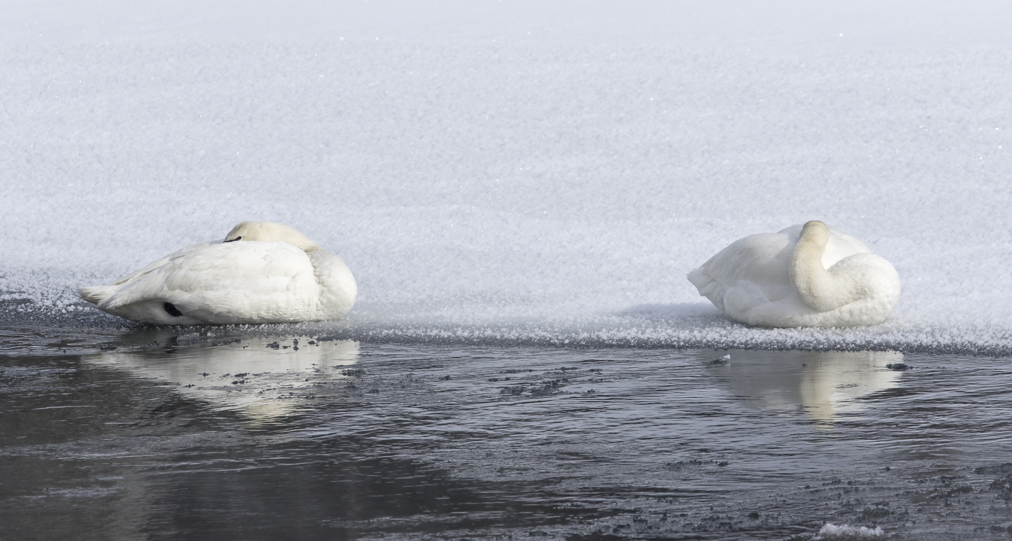 Just upstream, we encountered our first trumpeter swans of the trip, a pair resting quietly on the edge of the ice.