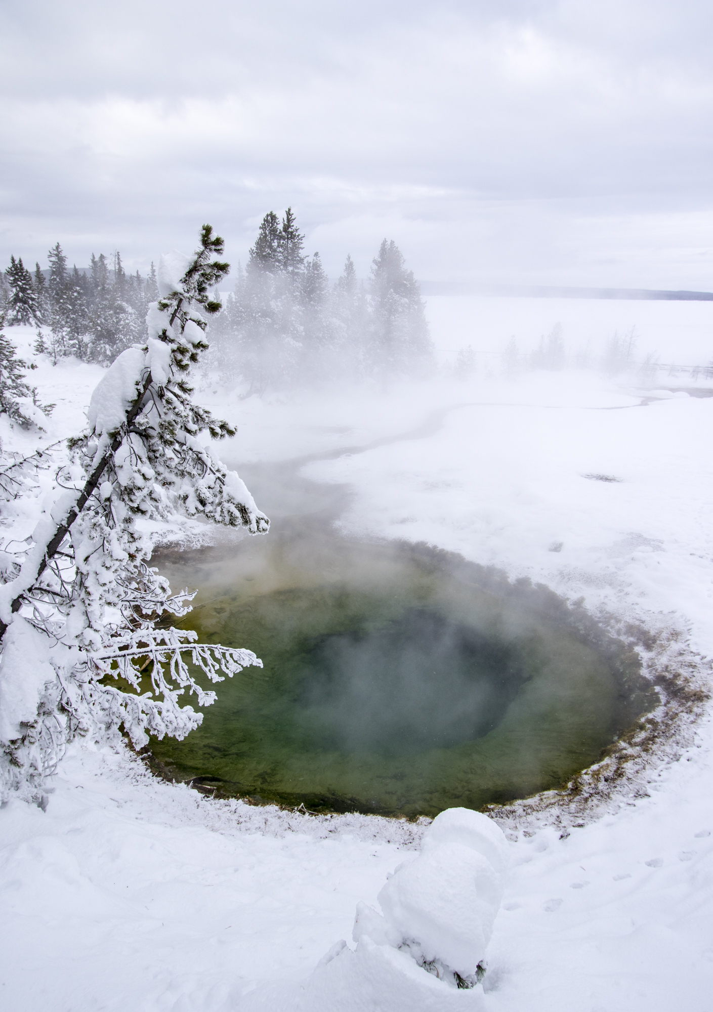 By the time we reached West Thumb Geyser Basin, a thick cloud cover had helped create a world of stark contrasts of black and white with occasional tinges of thermally induced color. I wish it wasn’t so expensive to charter a snow coach, as this trip is something more people need to experience. Being surrounded by a seemingly endless landscape of cold and ice, punctuated by otherworldly thermal activity, and having the opportunity to observe how wildlife adapts and survives in such a hostile place, gives one pause to consider the meaning of wildness, of beauty, and of life itself.