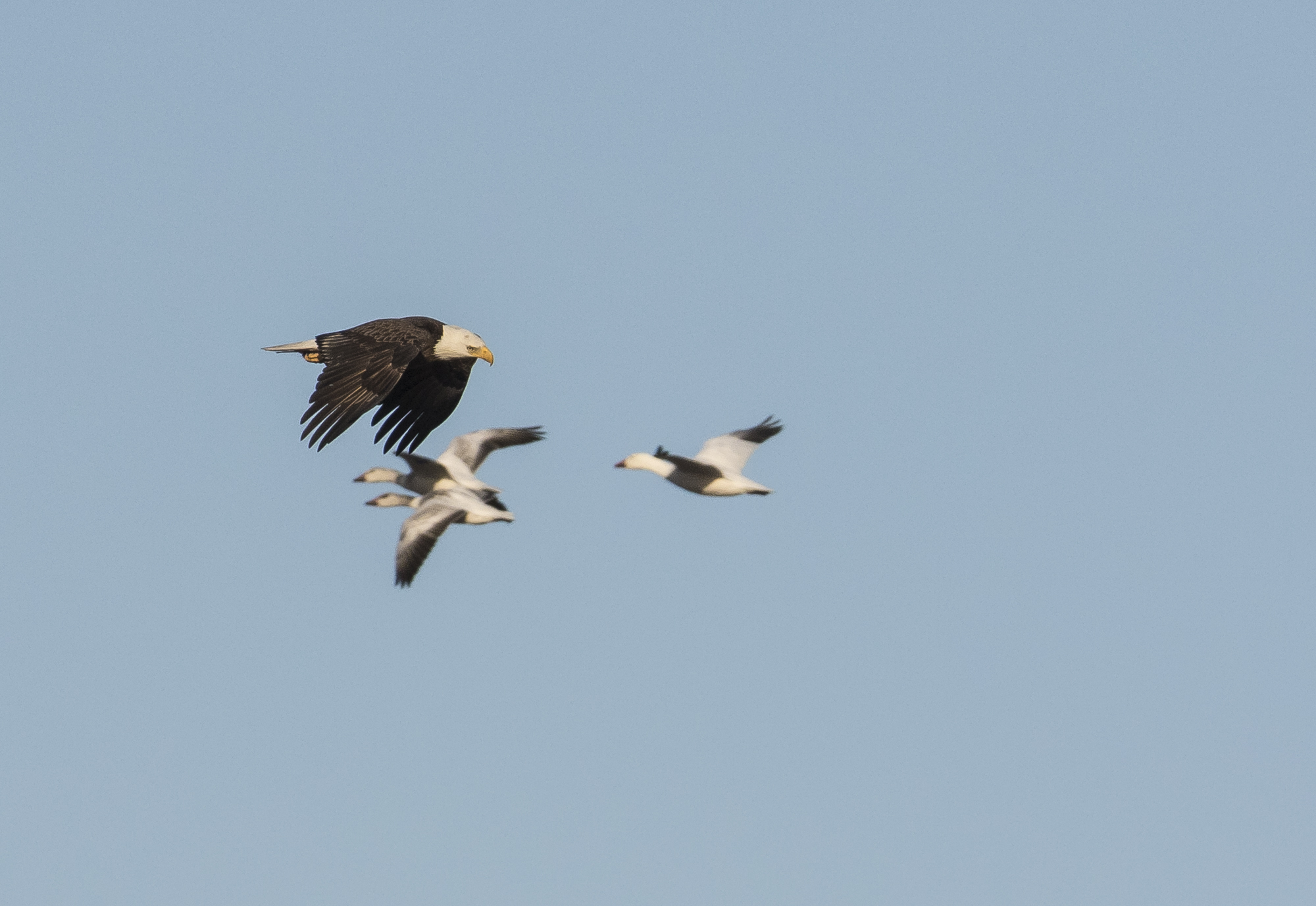 An adult bald eagle was flying across the field, looking over the flock for any possible weaknesses. When it got to the other side I saw two more eagles, perched, waiting, hoping for a chance at a goose breakfast.