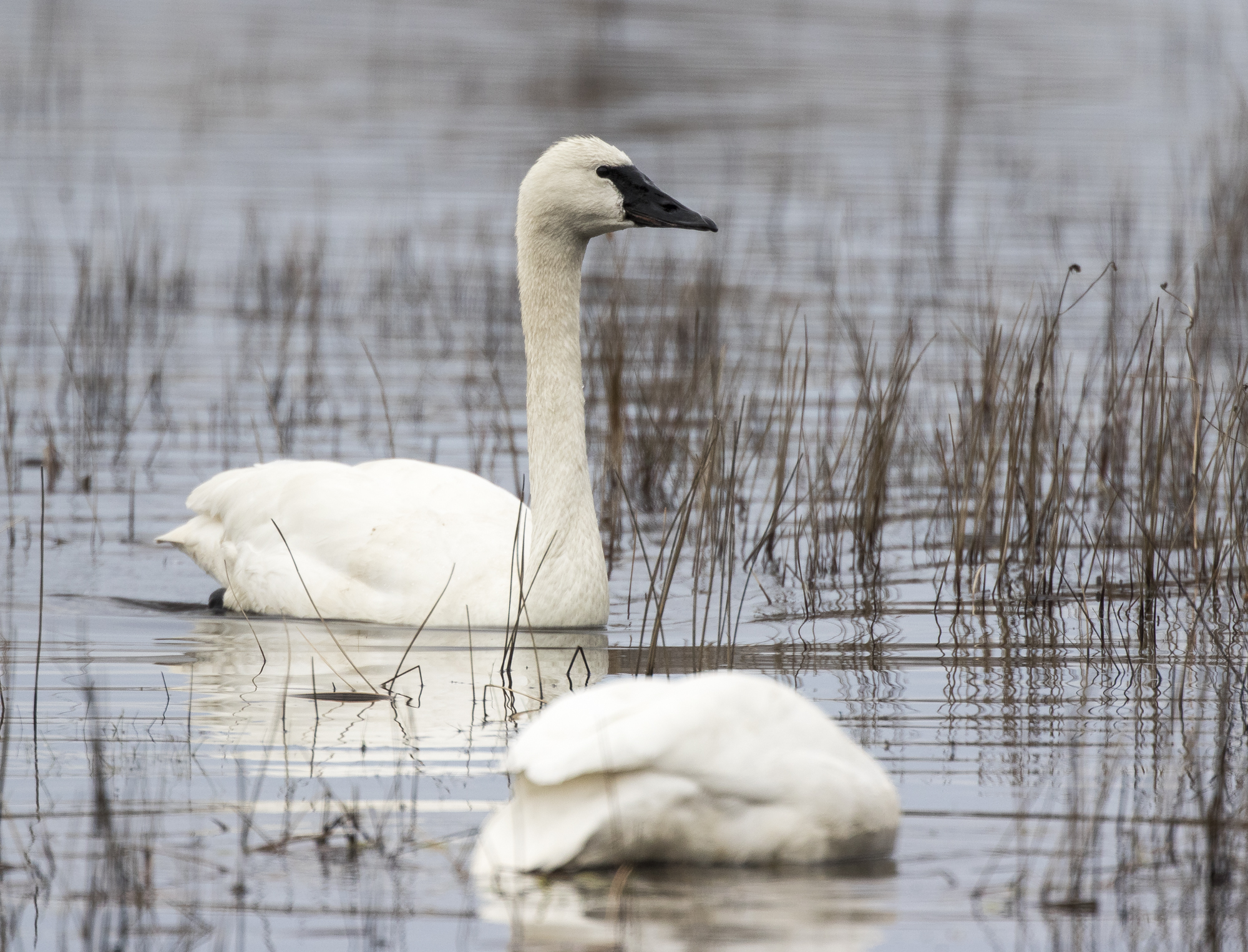 On the back loop of Wildlife Drive, I stopped to photograph some swans and in looking at the images a little later, found one that resemble a trumpeter swan – longish bill, no yellow on the bill (not always a guarantee it isn’t a tundra swan). What do you think?