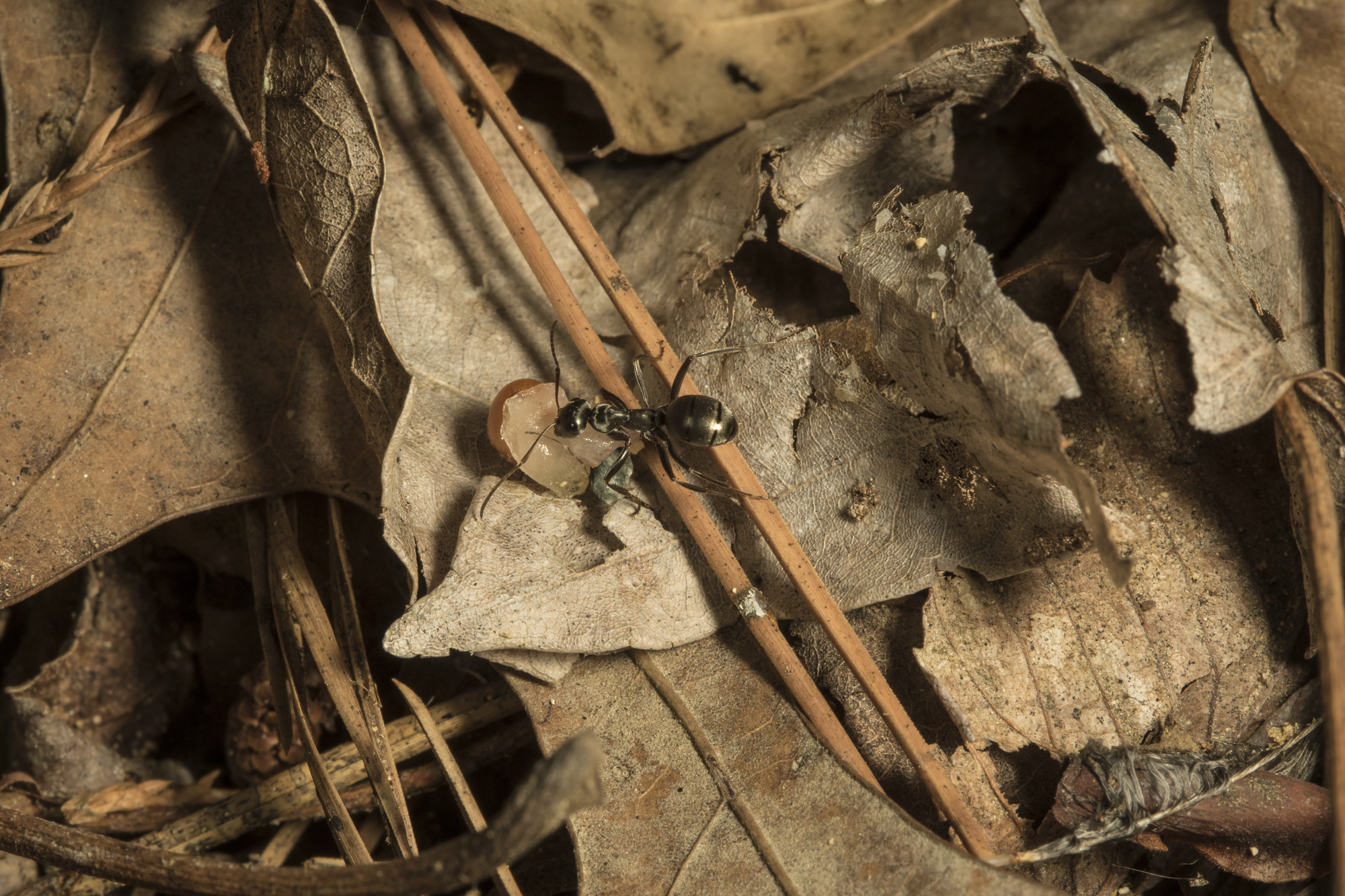 An ant with its prize just before disappearing into the nest beneath the leaf litter