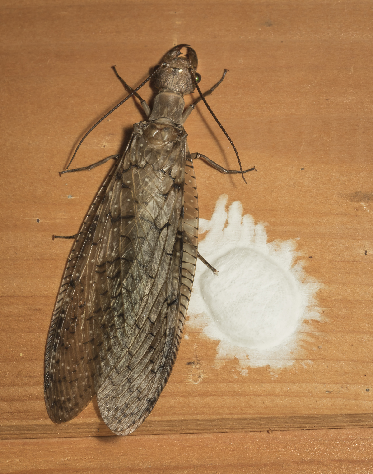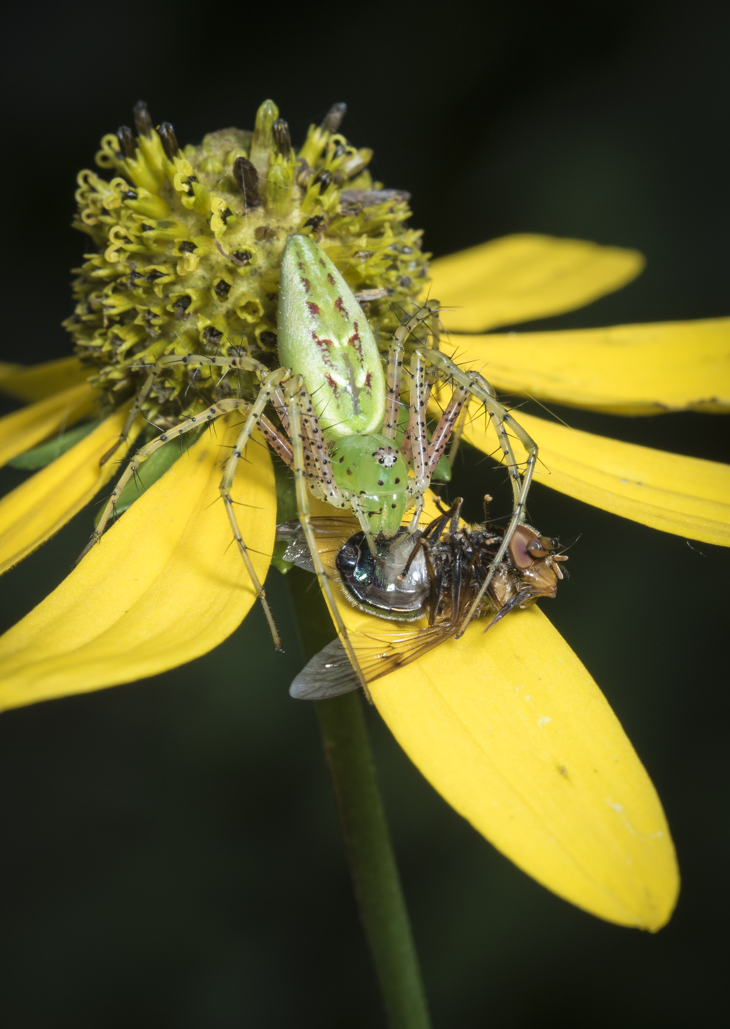One young camper had a talent for catching almost anything from lizards to skippers. He ran towards me one day with this juvenile Carolina Anole, saying, “Mr. Mike, it’s eating a moth”. Just as I snapped a photo, it gulped down its meal, oblivious to all the commotion (click photos to enlarge)We witnessed a lot of the “cycle of life” these past two weeks. Here a Bumblebee Mimic Robberfly has captured a bumblebee.Another view of robberfly and bee – you can see some differences in the mimic and the model here – the robberfly has short antennae and very different eye structureGreen Lynx spiders are now large enough to easily see in the wildflowers, where they prey heavily on pollinators, including wasps and beesAnother Green Lynx with a fly. These active hunters do not build webs for capturing their prey, but instead pounce on them like a large catPerhaps a nymph of one of the Spiny Assassin Bugs?We had a lot of critters land on us during camp. This jumping spider (Hentzia sp.?) picked one of our more squeamish instructors to hitch a ride on.An ant dragging a dead wasp. One camper told me “ants are the strongest animals in the world and they can carry over 10 times their own weight”. I googled it and found that ants are, indeed, incredibly strong and are believed to be able to carry 10-50 times their own weight (equivalent to a human lifting ~9000 pounds). Their body structure and movement are being studied by engineers in the hopes of designing powerful microbots to perform all sorts of tasks. Who is teaching who in this camp?Hackberry Emperor butterflies frequently perch on humans to imbibe our salts (sweat)Our visit to the vernal pool in the woods yielded a variety of newly transformed amphibians. Eastern Narrow-mouthed toads, actually tiny toad-like frogs, were everywhere along the edge of the pool.Fowler’s Toad toadlets were also commonA very tiny Cope’s Gray Treefrog (note the diagnostic white patch under they eye)This American Dagger Moth caterpillar provided a lesson in being a naturalist and observing the world around you. I found some frass (insect poop) on the trail. After helping them figure out what it was, I asked the campers where to look for the caterpillar that made it. After a couple of guesses in all directions, one camper figured it out and pointed up. We brought it into the classroom to observe for a few days before releasing it back into the wild. The campers named this hairy caterpillar, “prickly pear”.We all witnessed an amazing act – a female Dobsonfly laying her egg case on the wall outside the classroom (it took over an hour). Unfortunately, the hatchlings will not fall into a suitable aquatic habitat when they emerge.A short-horned grasshopper nymphA newly emerged damselfly with exuvia on an emergent stem of Pickerelweed