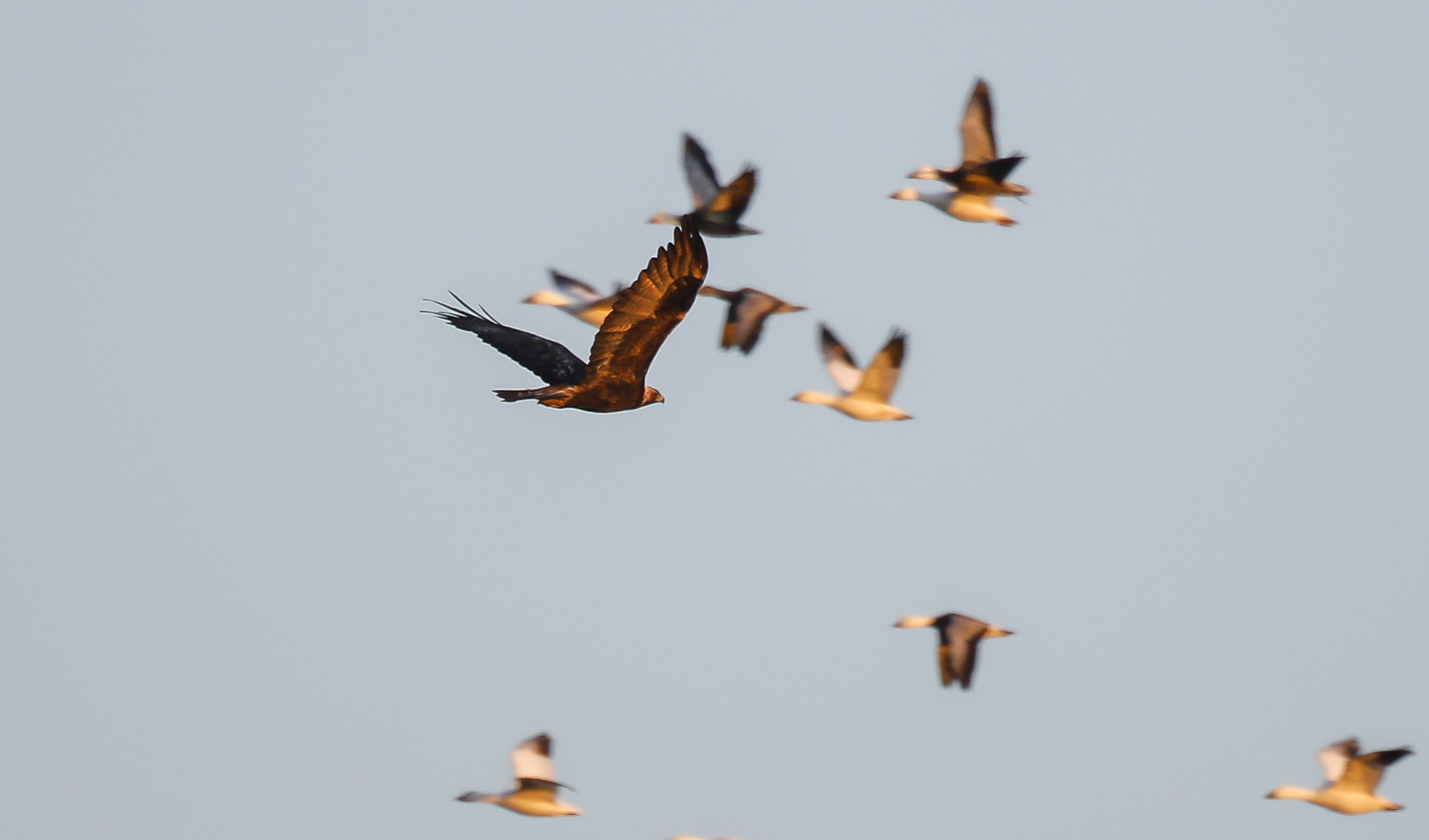 As I watched them circle, I saw a dark form flying far out over the field. This was what spooked them, an eagle! I snapped a few pictures, trying to get the eagle in the same field of view as the panicked snow geese, and then resumed watching the birds quickly return to the field to feed as the eagle disappeared. It wasn’t until I got home and looked at the images that I got a nice surprise…I’m pretty sure that potential goose predator was a golden eagle! Golden eagles are not common sights here in NC, but I have seen them several times in winter over the years here at Pungo, lured no doubt by the thousands of waterfowl on the refuge. This is a heavily cropped image, but all indications are it is a golden eagle, not an immature bald eagle. The lack of any whitish mottling under the wings and what looks like a golden neck sure seem diagnostic, but if any of my bird nerd friends have a different opinion, please let me know