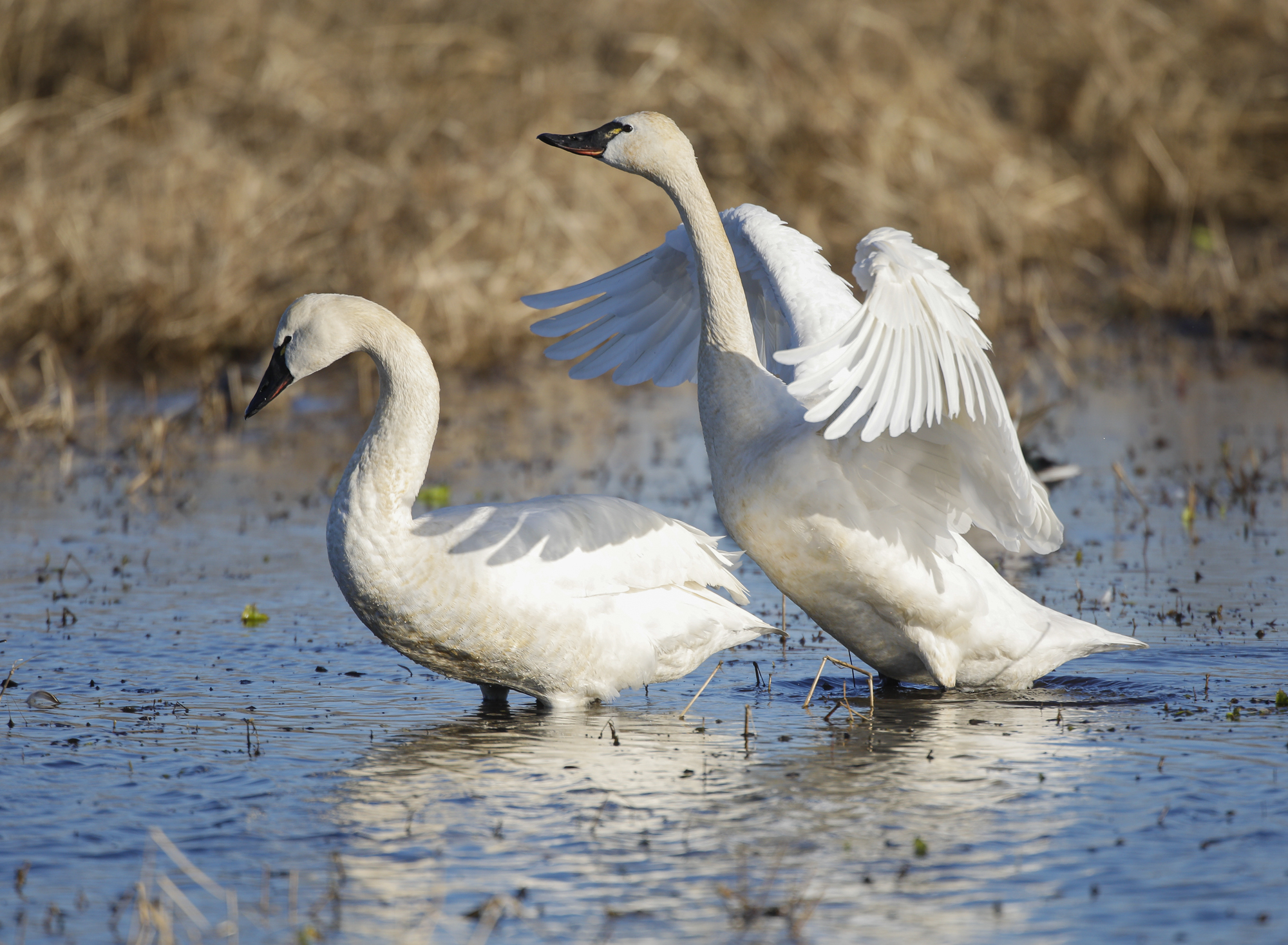 I drove through the refuge scouting for bear, otter, or beaver, but saw none. So, I settled into the corner of Marsh A where a small group of tundra swans was feeding alongside a few ducks (mainly Northern shovelers, mallards, and Northern pintails). The sandhill cranes out toward the middle of the marsh were the main attraction for the two other cars at the site, so I had my little corner all to myself. I pulled my car in at a slight angle (off the road enough to allow easy passing by other cars), got out the camera, and sat and watched and waited. When I first pulled up, the pintails flew off, and the swans swam slowly away, but then stopped when I stopped. This is where so many people make the mistake of getting out of their car which often causes any nearby ducks to fly, and may send the swans swimming even farther off. Your car is definitely your best blind, and patience is your ally.