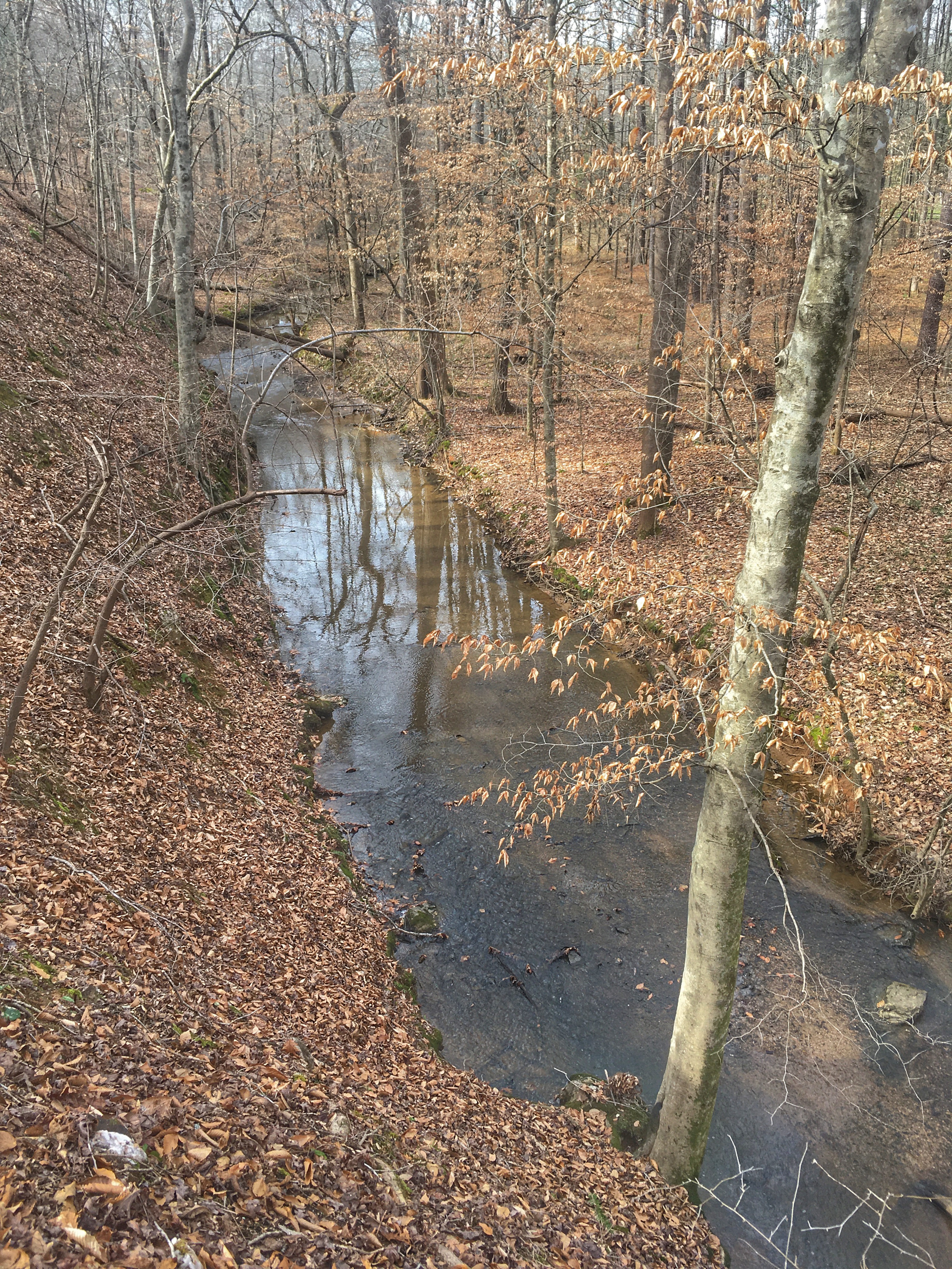 I appreciate the winter woods for their openness and the ability to see the bones of the landscape – the trees, vines, and boulders that give character to a forest. The trails at Johnston Mill are well-marked and pass through a variety of habitats from bottomlands to beech bluffs to open meadows along a power line. My favorites were the new Aphid Alley Trail (not yet marked on the kiosk maps but available on their maps online) and the Beech Loop. They highlight beautiful American beech trees and some steep slopes along creeks with wonderful vistas.