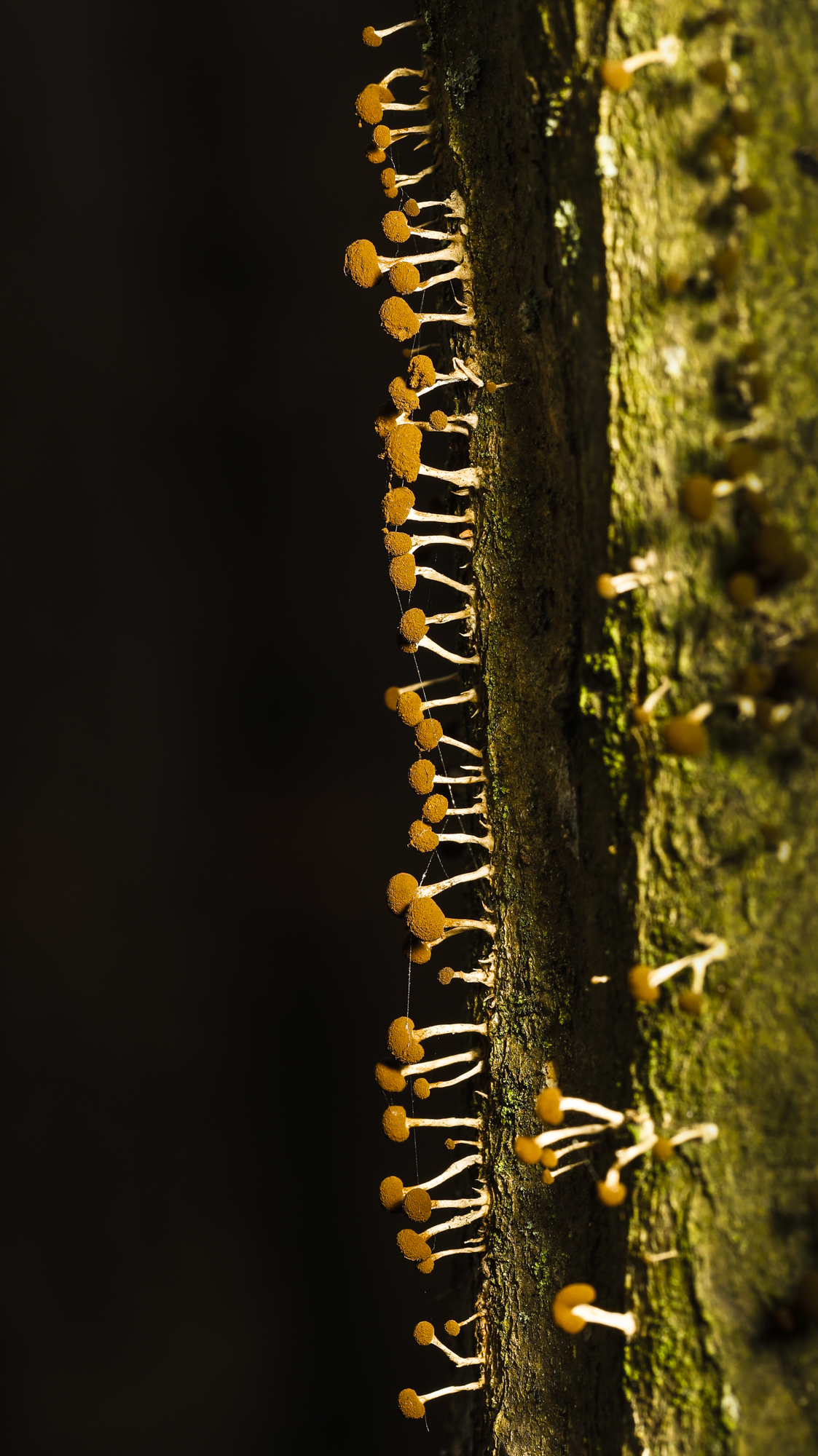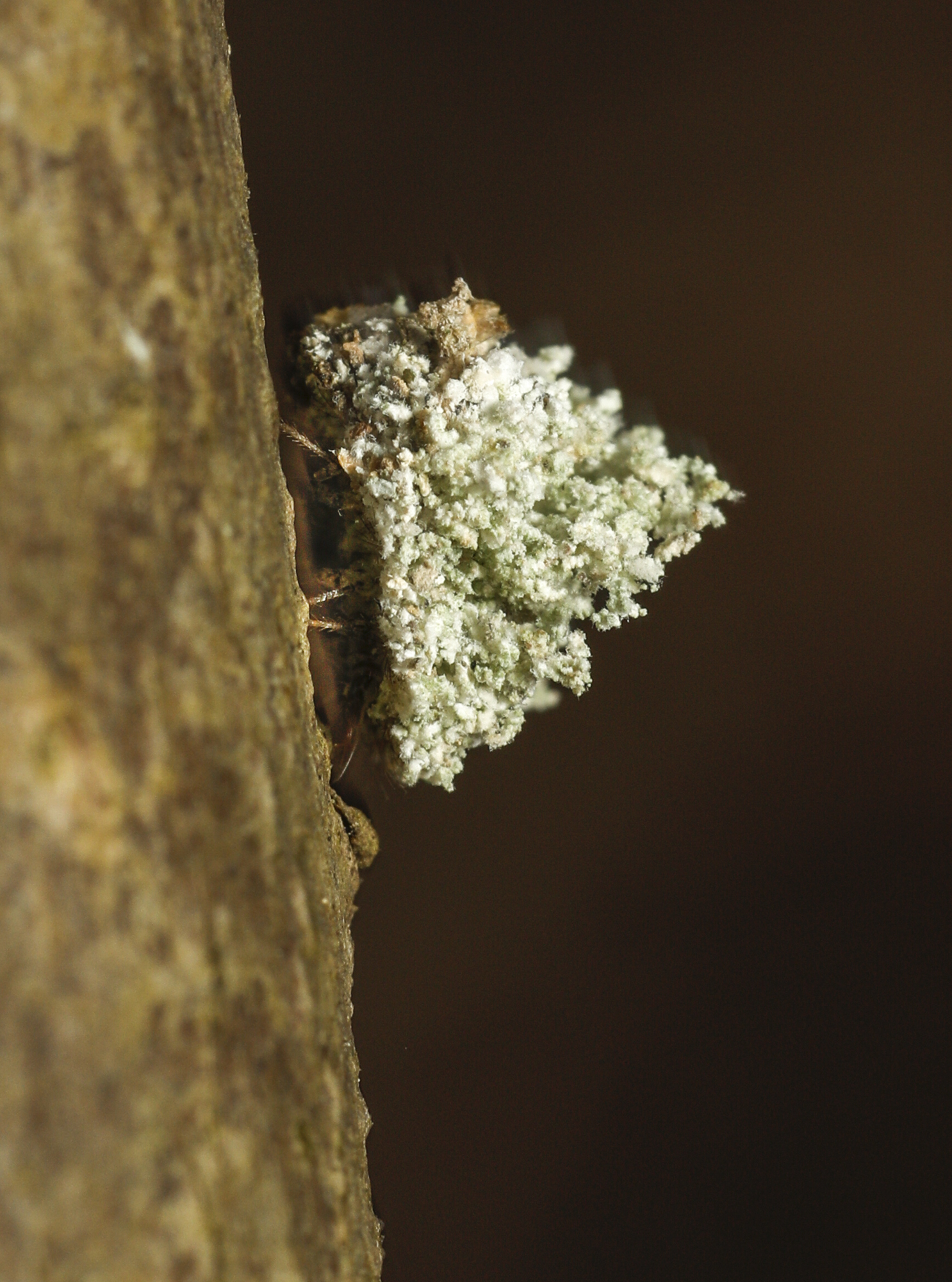 During a brief pause, I glanced down and saw a line of tiny mushroom-like structures on a nearby tree trunk. Our first thought was slime mold fruiting bodies. My friend, Jerry, submitted some pictures to his local fungi expert who thinks it is probably a fungus, maybe Phleogena faginea. One common name I saw for this species is Fenugreek stalkball. When warmed, the fruiting bodies apparently smell like fenugreek (another new word for me), a curry-like powder derived from a plant of that name.