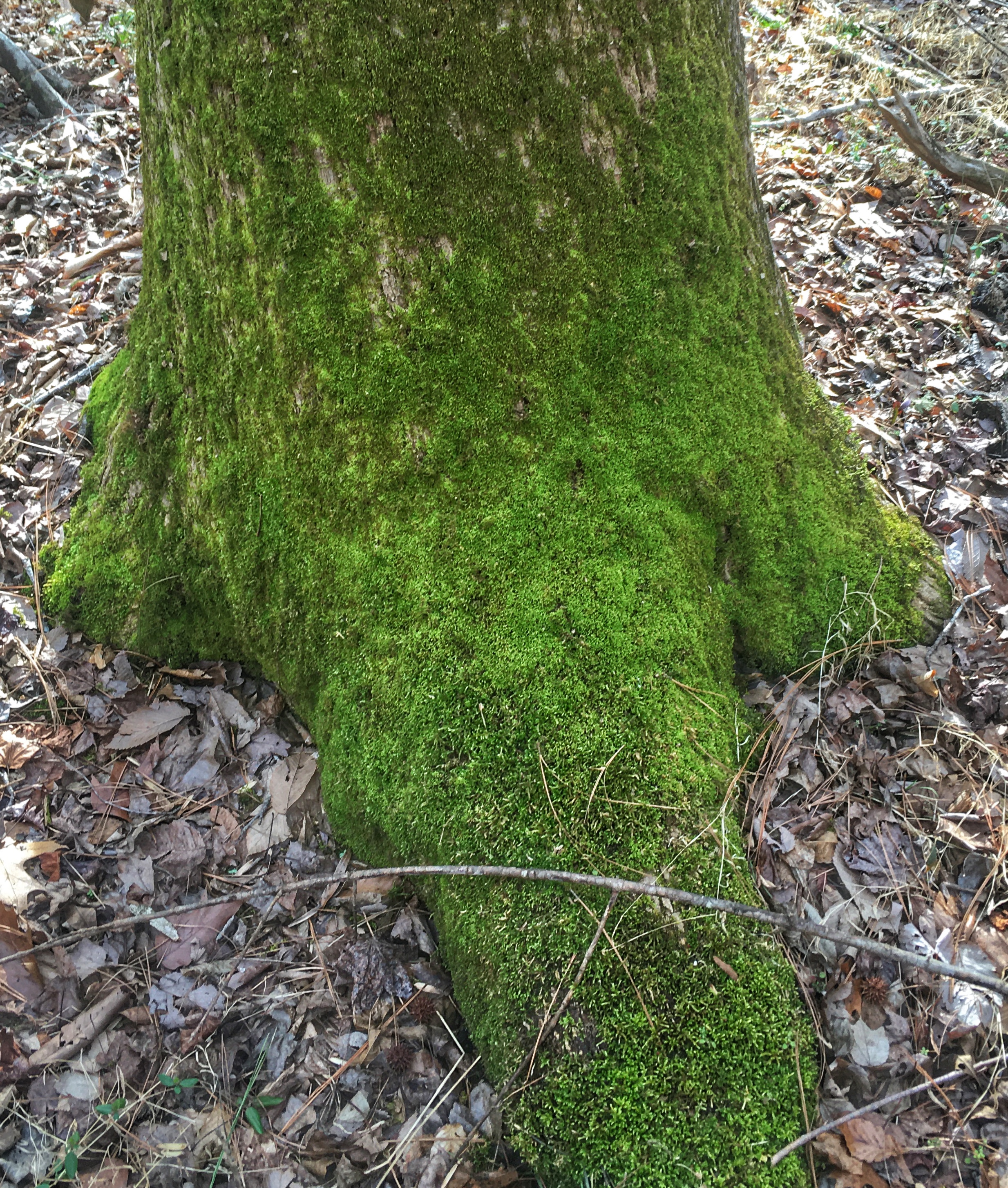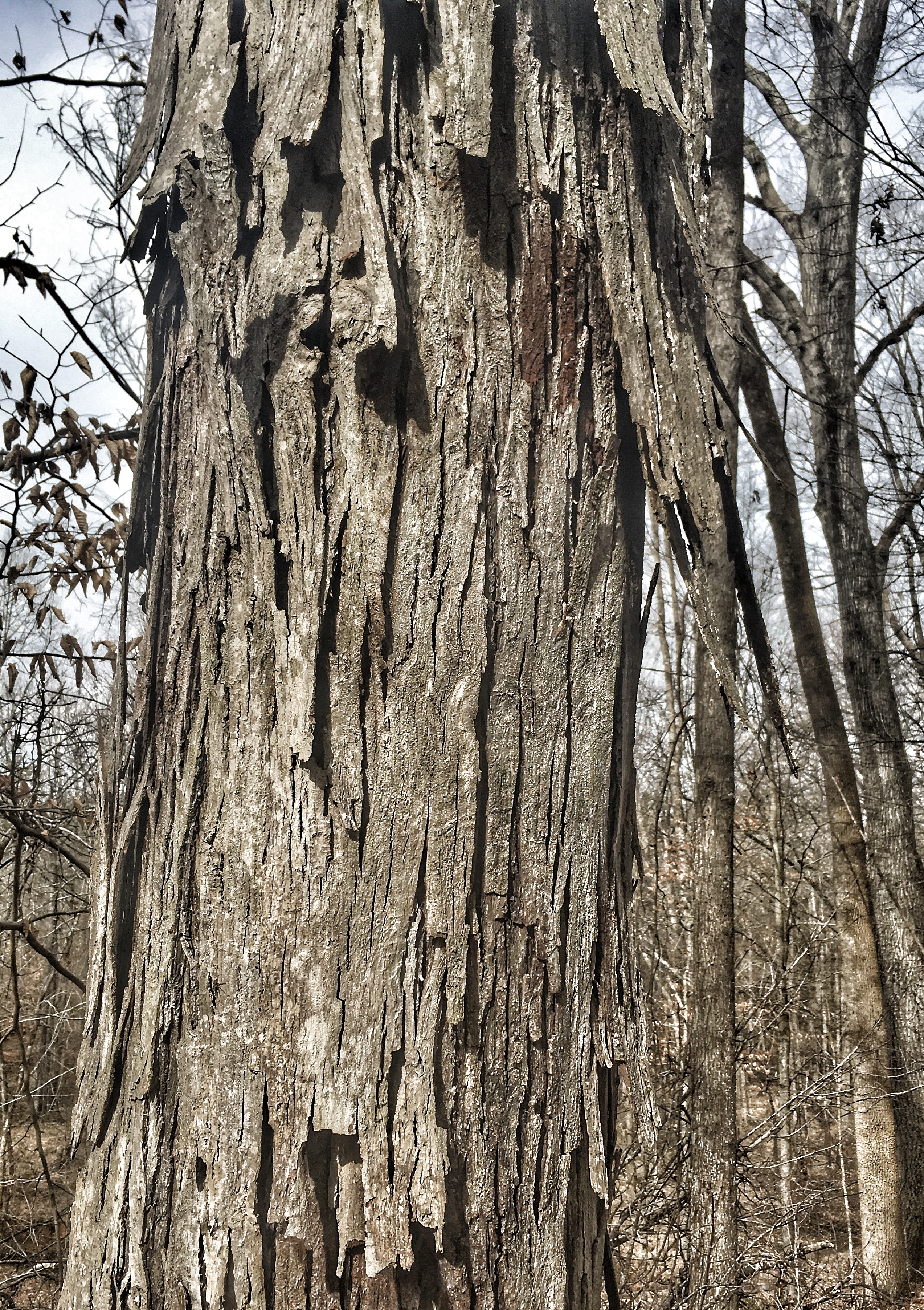 The peeling bark of American sycamore and shagbark hickories are another tree trunk treasure easily observed in the winter woods. Once again, the reasons for this phenomenon are not clear cut. Some trees may exfoliate (the term that describes shedding of bark) to rid the trunk of parasites, others to increase gas exchange or photosynthesis of bark tissue, but I’m mystified as to the ecological advantage of peeling plates of bark on a shagbark. Undoubtedly, it makes for good habitat for a host of associated organisms from insects to bats, but I’m not sure what the advantage is to this species of hardwood (I welcome your thoughts or references).