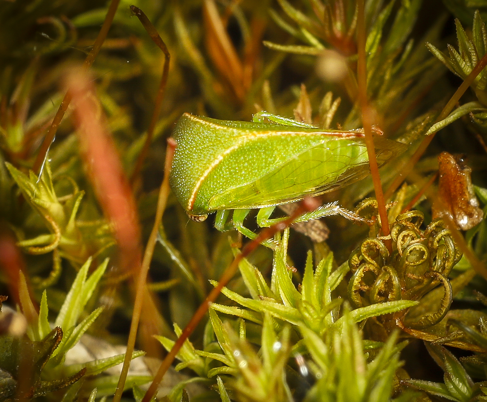 It’s not only upright, living tree trunks, that are adorned with interesting garb, but also fallen logs in various states of returning to the soil. One large log had a variety of mosses, lichens, fungi, and a mysterious orange blob that we thought might be a slime mold. It turns out to be a fungus in the genus, Phlebia (thanks, Van Cotter, for the fungi ID assistance). Once again, when I looked at the image on my laptop in higher magnification, my eye caught something I had missed in my quick field photo. Along the upper edge of the picture are some dark elongate “mini-bugs”. They look like springtails of some sort.