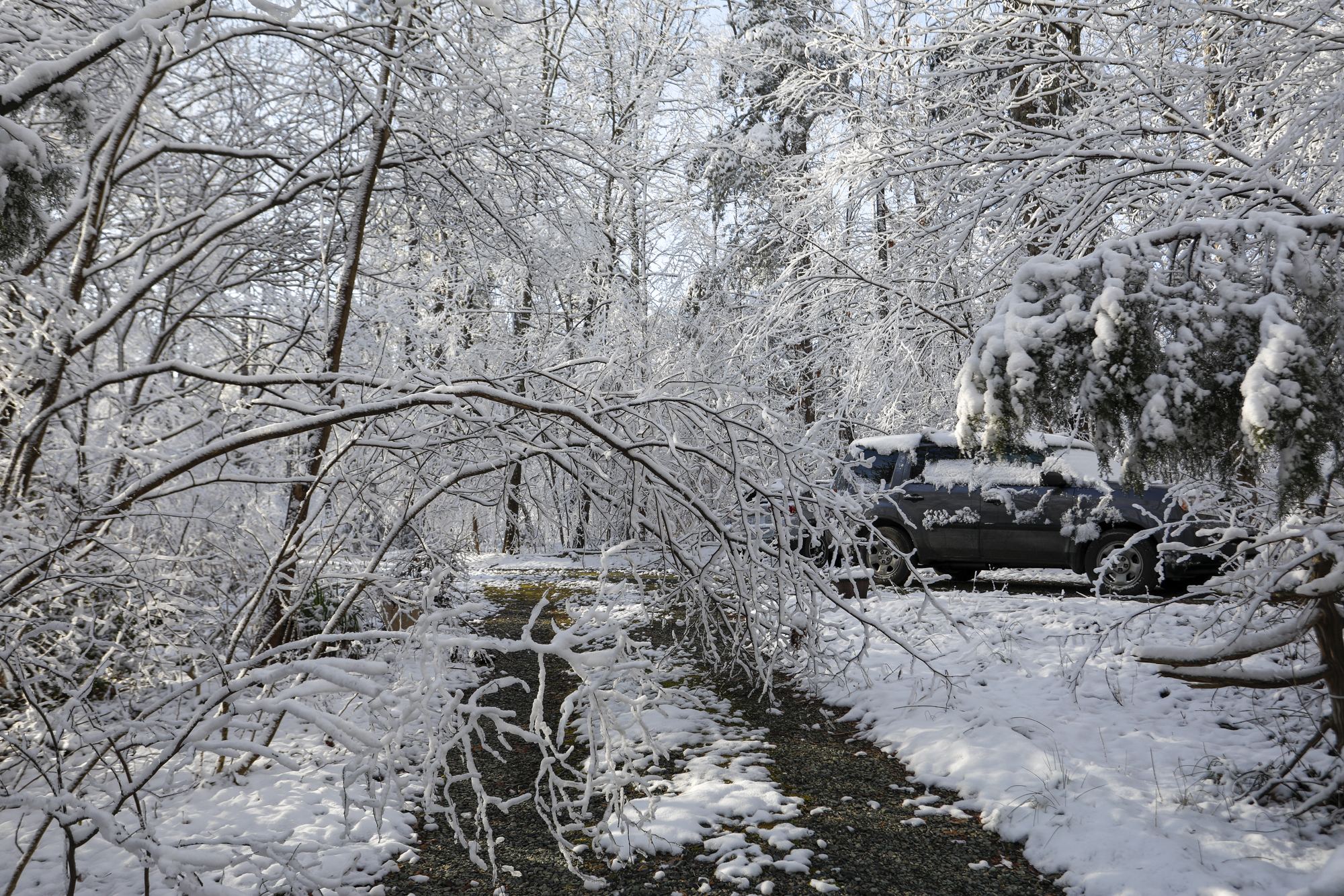 And surprise it was….they predicted it, and it actually snowed! That has been an unusual happening in these parts for over 450 days (I believe I heard the last measurable snow fall in central North Carolina was about 469 days ago). It started about 3 p.m. Thursday and lasted well into the night. The other surprise was how it affected the trees – it was a wet heavy snow with temperatures dropping rapidly, so ice built up on delicate tree limbs. By Friday morning, it looked as though all our small trees were bowing to the snow gods.