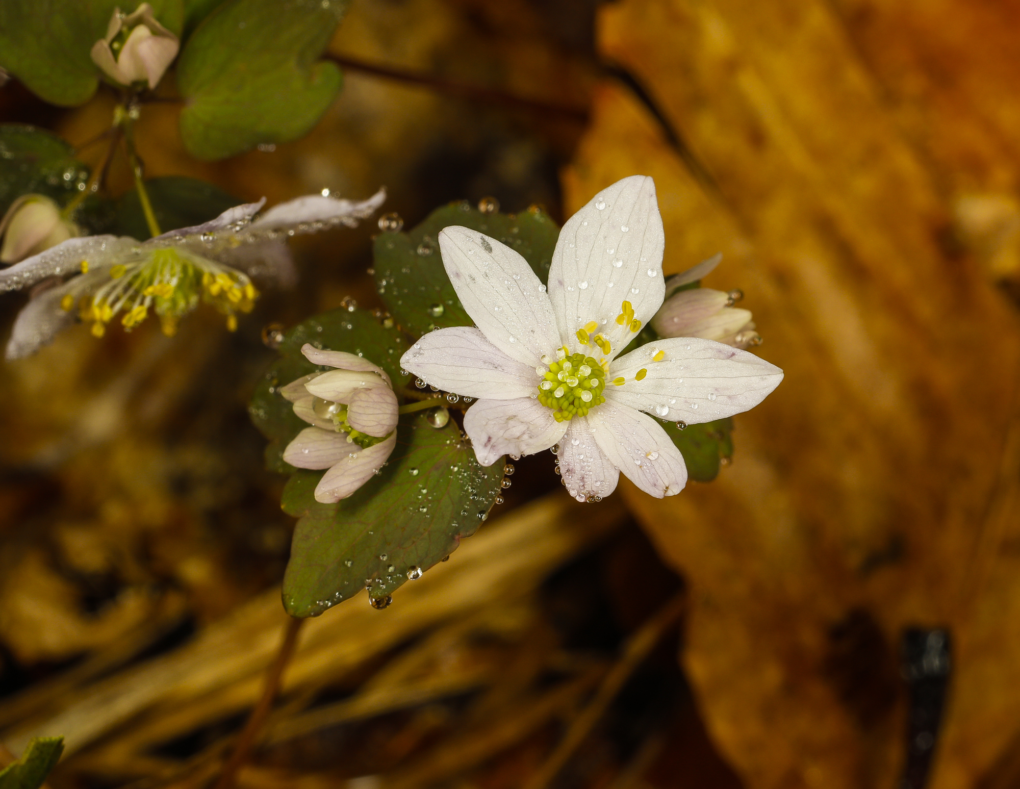 The past couple of days have been warm and spring-like with highs around 60. Yesterday morning dawned with a gray coating of fog across our woods, coating everything in tiny jeweled droplets that highlighted the onset of early spring wildflowers. Today changed all that with high temperatures more than 20 degrees colder and a brisk wind. Even though I love the cold weather (and it is much better for tasks like chainsawing and splitting firewood which I did today), the taste of spring was appreciated. Here are a few photos of what was out yesterday and a hint at what is coming…