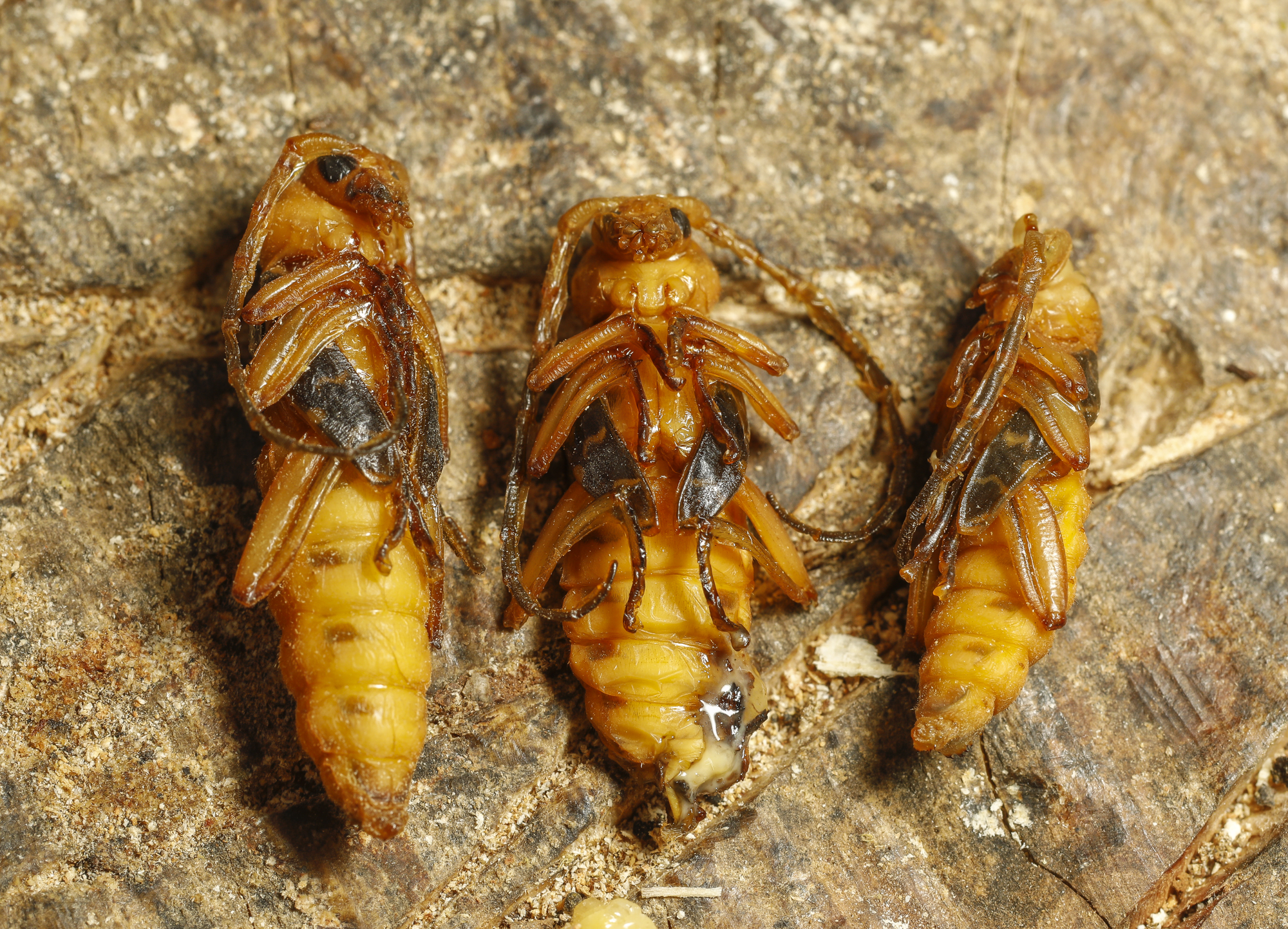 This species of long-horned beetle emerges in early spring, so these pupae are almost ready. After mating, a female will lay up to 50 eggs (that explains the abundance in my logs) in the bark of weakened wood or wood that has been dead for no more than a year. Hatched larvae chew into the wood and feed for 10-12 weeks before making a larger chamber for pupating, where they will remain until the following spring.