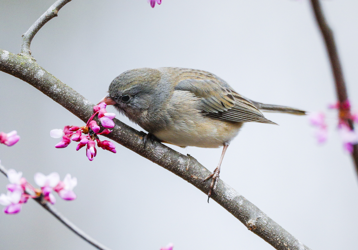 Many of you may know (or may have seen Melissa’s FB post about it) that redbud flowers are actually quite tasty as a treat alone or as part of a salad (or other types of foods). So it should come as no surprise that other critters may find them suitable as a food source. I have often wondered about the use of the incredibly abundant seed pods by birds and other wildlife, but have never seen anything actually eating the seeds.