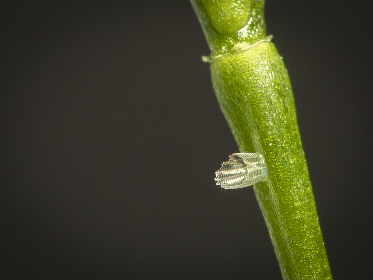 It took some searching with a magnifier to find each of the new larvae. They are only about 2 mm in length and have tiny hairs scattered on their body with what looks like a drop of liquid at the tip of each hair. This may be some sort of predator deterrent. I found both larvae feeding on a developing seed pod of their respective plants. With the month ahead being one of mainly home-bound observations, I’ll keep tabs on these guys and try to provide an occasional update on their progress and changes (because I know you just need to know:).