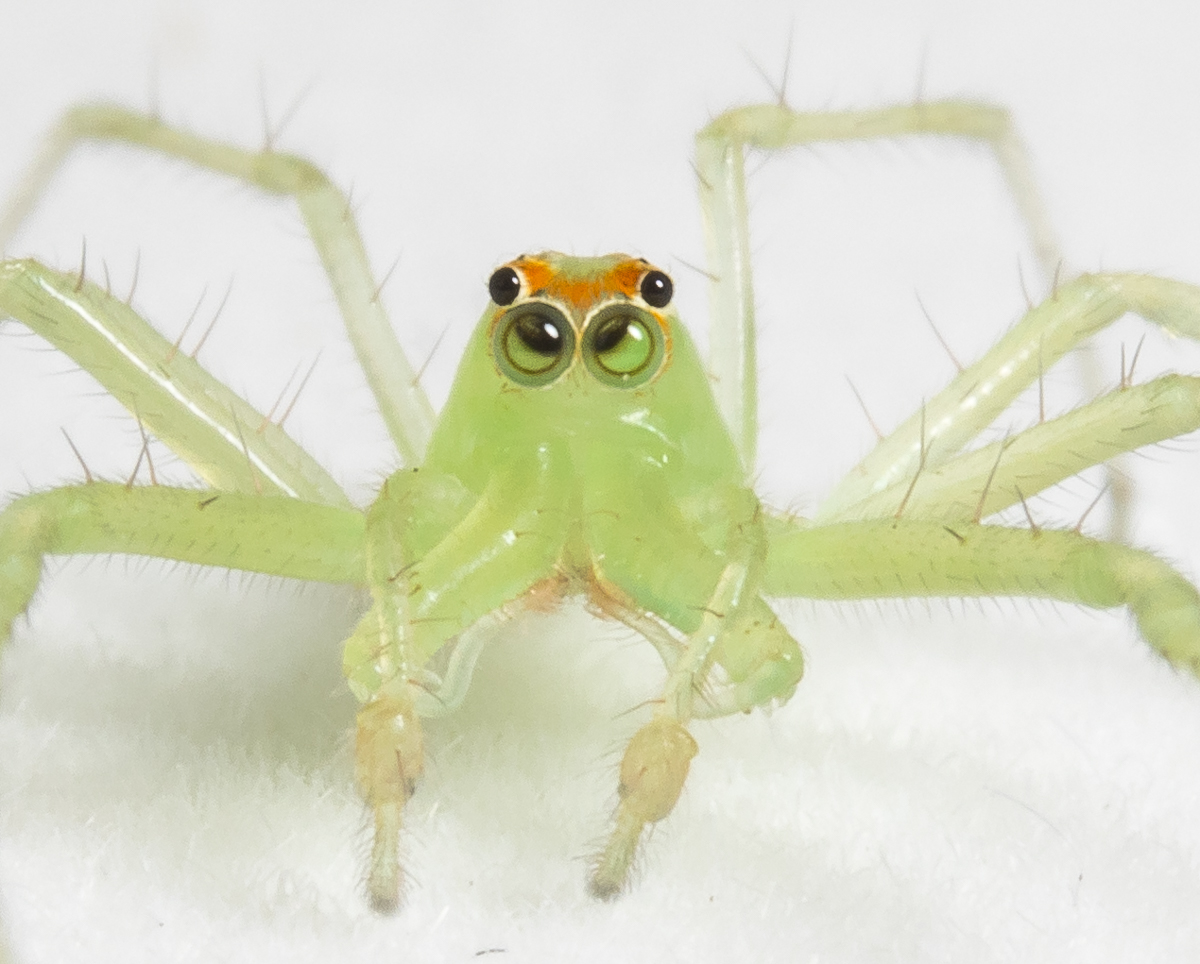 One of the things I love the most about these spiders is how it is really easy to see the retinas in the large eyes on front move around inside as they spider looks around (the lenses are fixed to the the carapace, but the retinas inside can be moved by tiny muscles). When the eyes become dark, the spider is looking directly at you (I think this guy is looking at my pandemic haircut). After a couple more shots, I took him back outside to patrol the yard in his new duds.