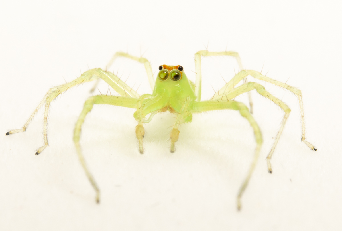 Melissa was producing a short video on trees as part of her museum educational offerings for teachers when she made a fascinating discovery. While filming the segment, she was encouraging folks to observe trees in their neighborhood and look for interesting things living on them. When she grabbed a hickory leaf and looked at it, she found one of my favorite spiders – a Magnolia Green Jumper (Lyssomanes viridis). We have a lot of these beautiful little jumping spiders in our yard and woods, but this was one even more exciting than usual as it has just molted.
