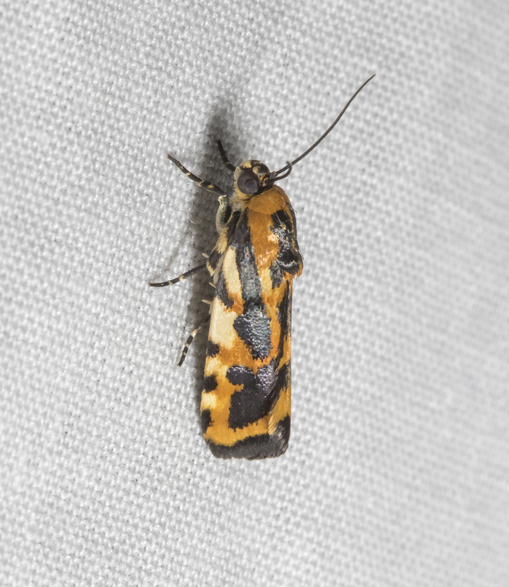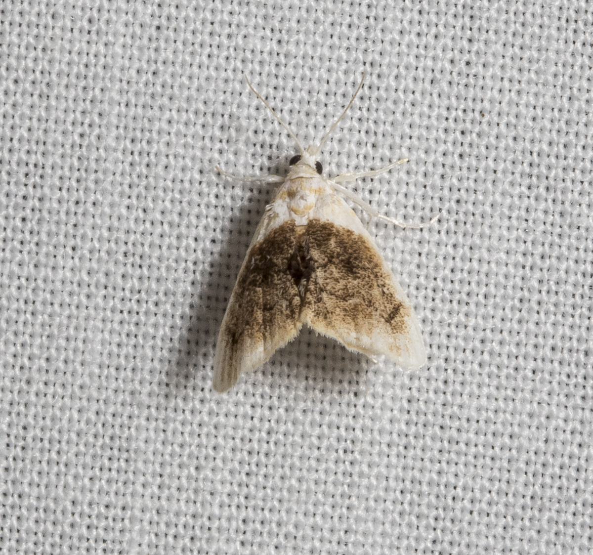 Common Spragueia Moth, Spragueia leo, a small bird-dropping moth (click photos to enlarge)Another tiny moth, a Double-banded Grass-veneer, Crambus agitatellusThe adult form of one of our favorite caterpillars, the Crowned Slug Moth, Isa textulaCommon Pinkband, Ogdoconta cinereolaA very small, but beautiful, Sooty Lipocosmodes, Lipocosmodes fuliginosalisA snappy dresser, a Striped Oak Webworm, Pococera expandensNeutral colors are in this year – Large Paectes Moth, Paectes abrostoloidesDusky Groundling, Condica vecorsTerrenella Bee Moth, Aphomia terrenella – not much is known about this species but larvae may feed on the honeycomb and/or larvae of beesThough simialr in appearance to others in its group, I think this is a Bicolored Angle, Macaria bicolorataLarge Mossy Glyph, Protodeltote muscosulaDimorphic Macalla Moth, Epipaschia superatalisThe prize-winning moth of the night, a Virginia Creeper Sphinx, Darapsa myron (we both really love the sphinx moths for their beauty, patterns, and sleek design)