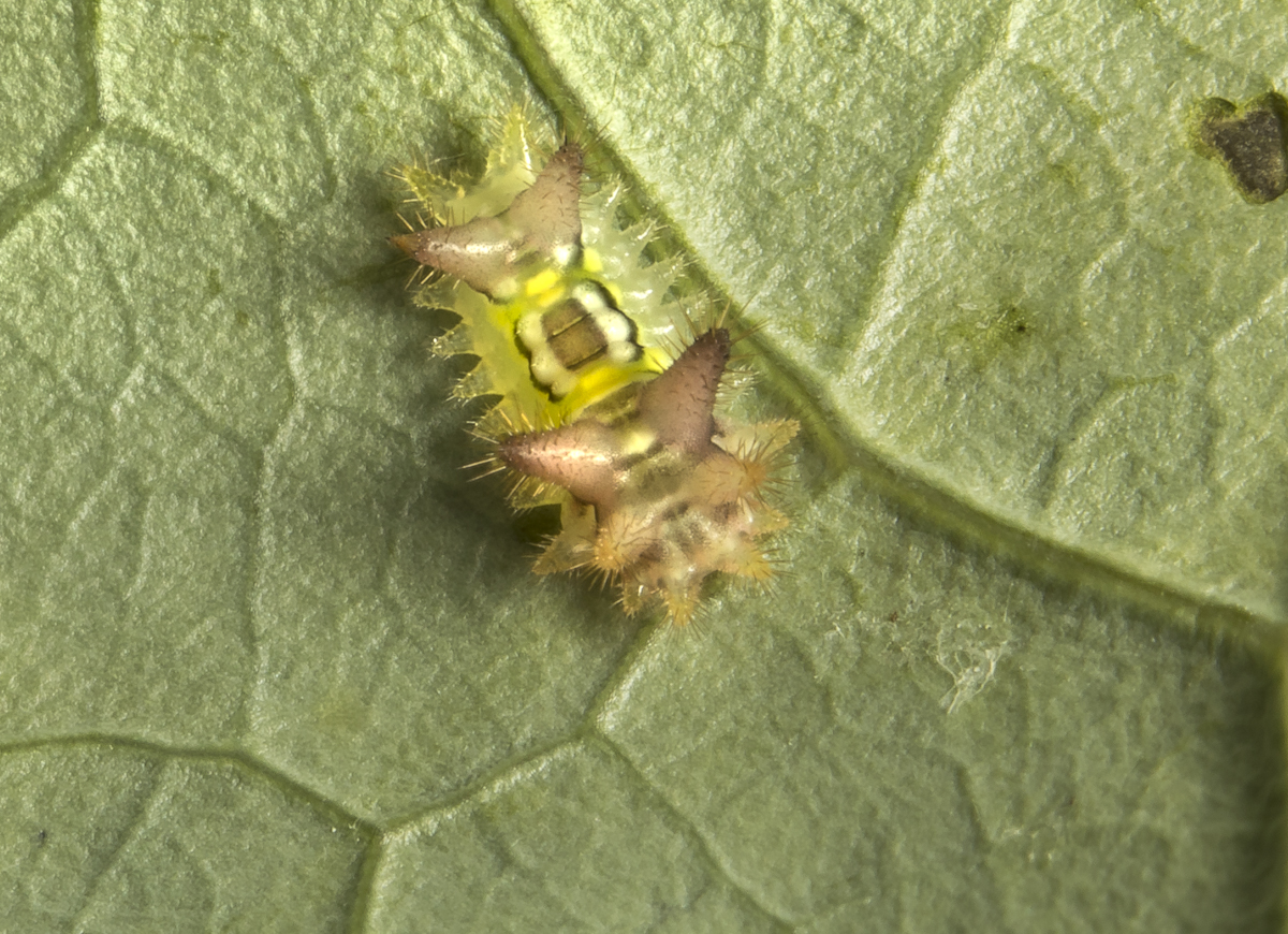 Though these guys are extremely small (the tiniest Saddlebacks either of us has ever seen), I think they have probably molted at least once already. Online descriptions say that the earliest instars lack the prominent tubercles on either end.