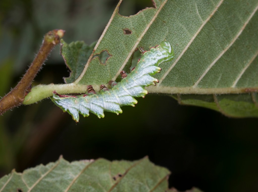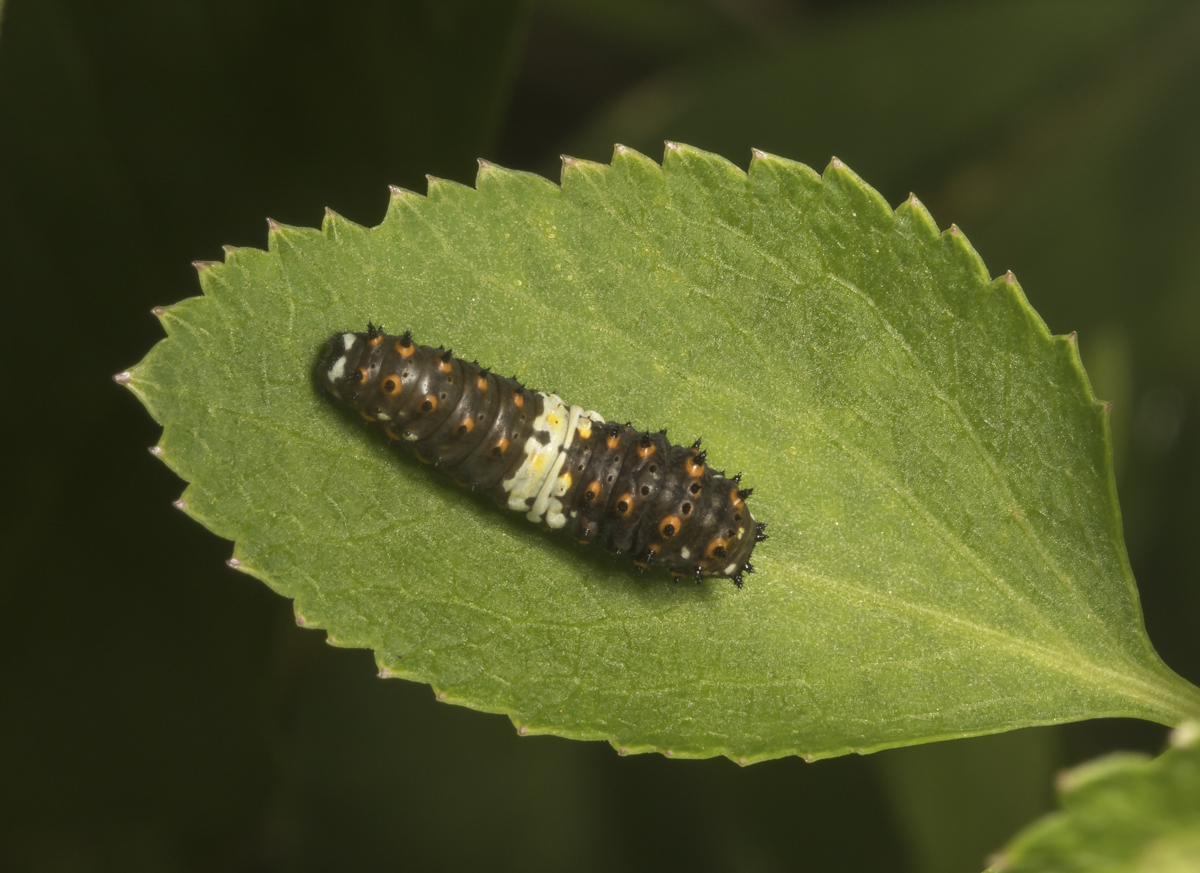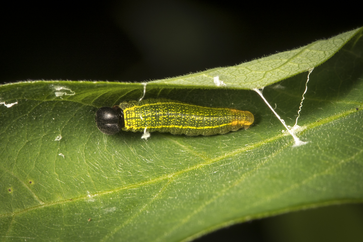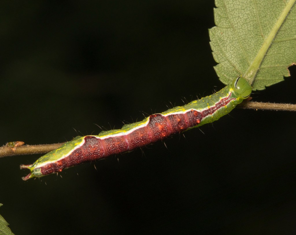 Black Swallowtail larva on Golden Alexander (click photos to enlarge)Variable Oak Leaf CaterpillarRose Hooktip Moth larva, the only Eastern caterpillar with a long unpaired “tail”. This one is on one of several Viburnums on our propertyMelissa found this Purple-crested Slug larva on the underside of a Redbud leafDouble-toothed Prominent on elm. The jagged dorsal surface mimics the serrated edge of an elm leafGrasshoppers and katydids are larger and more noticeable now. I think this one is a Short-winged Green Grasshopper, Dichromorpha viridisThis is probably a male Short-winged Green Grasshopper (males are generally two-toned, green and brown)The splayed leg Clipped-wing Grasshopper, Metaleptea brevicornisOne of several skipper species frequenting the yard now, a Clouded Skipper, Lerema acciusAlways one of my favorite yard finds, a Spicebush Swallowtail caterpillar with its glorious fake eyes After mowing yesterday, I walked the edges and noticed some rolled leaves on this legume (I think it may be a Naked-flowered Tick-trefoil, Hylodemum nudiforum)I held up one of the rolled leaves and this little guy came out – a new species of caterpillar for me, a Long-tailed Skipper!