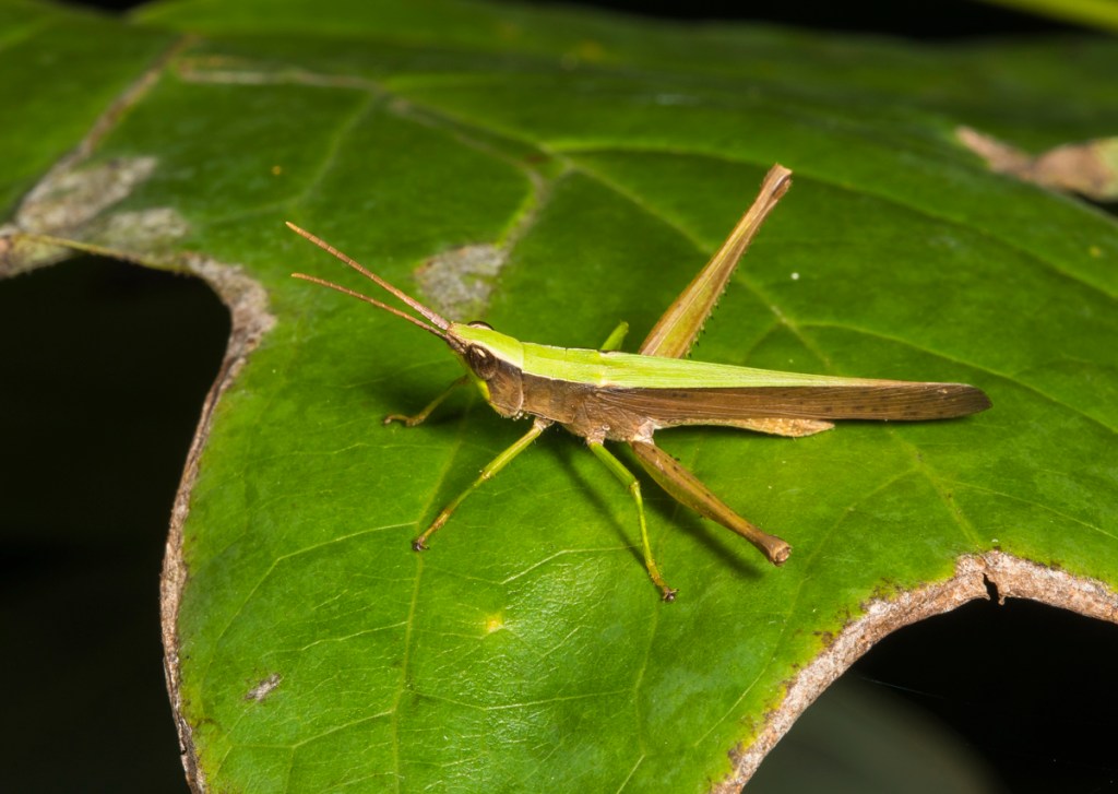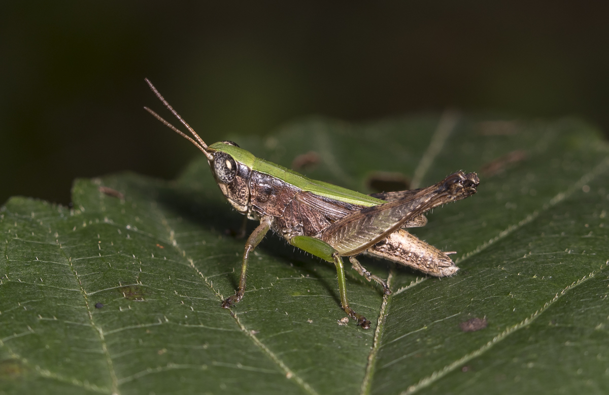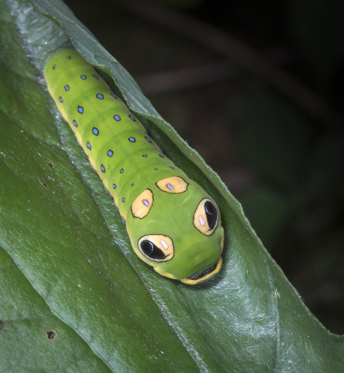 Black Swallowtail larva on Golden Alexander (click photos to enlarge)Variable Oak Leaf CaterpillarRose Hooktip Moth larva, the only Eastern caterpillar with a long unpaired “tail”. This one is on one of several Viburnums on our propertyMelissa found this Purple-crested Slug larva on the underside of a Redbud leafDouble-toothed Prominent on elm. The jagged dorsal surface mimics the serrated edge of an elm leafGrasshoppers and katydids are larger and more noticeable now. I think this one is a Short-winged Green Grasshopper, Dichromorpha viridisThis is probably a male Short-winged Green Grasshopper (males are generally two-toned, green and brown)The splayed leg Clipped-wing Grasshopper, Metaleptea brevicornisOne of several skipper species frequenting the yard now, a Clouded Skipper, Lerema acciusAlways one of my favorite yard finds, a Spicebush Swallowtail caterpillar with its glorious fake eyes After mowing yesterday, I walked the edges and noticed some rolled leaves on this legume (I think it may be a Naked-flowered Tick-trefoil, Hylodemum nudiforum)I held up one of the rolled leaves and this little guy came out – a new species of caterpillar for me, a Long-tailed Skipper!