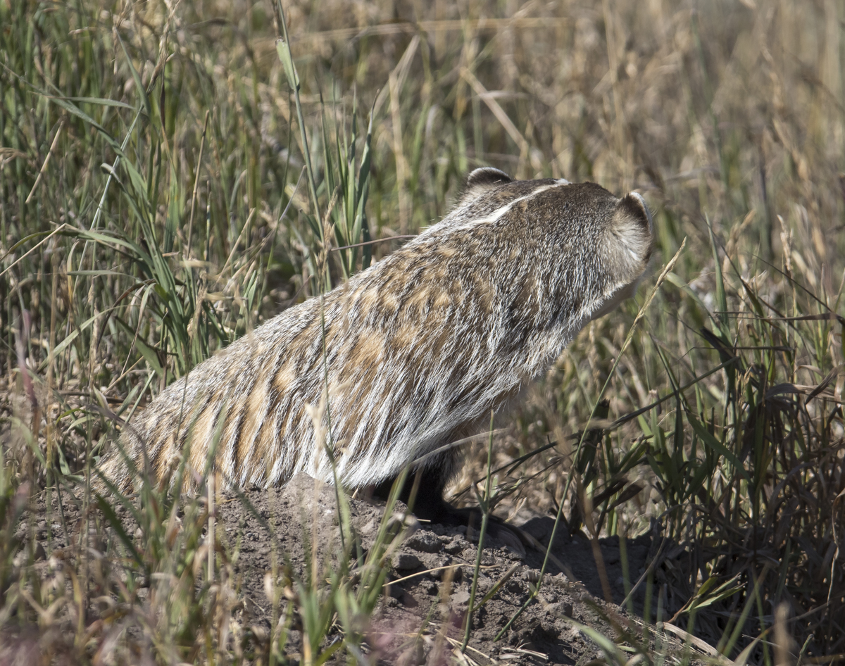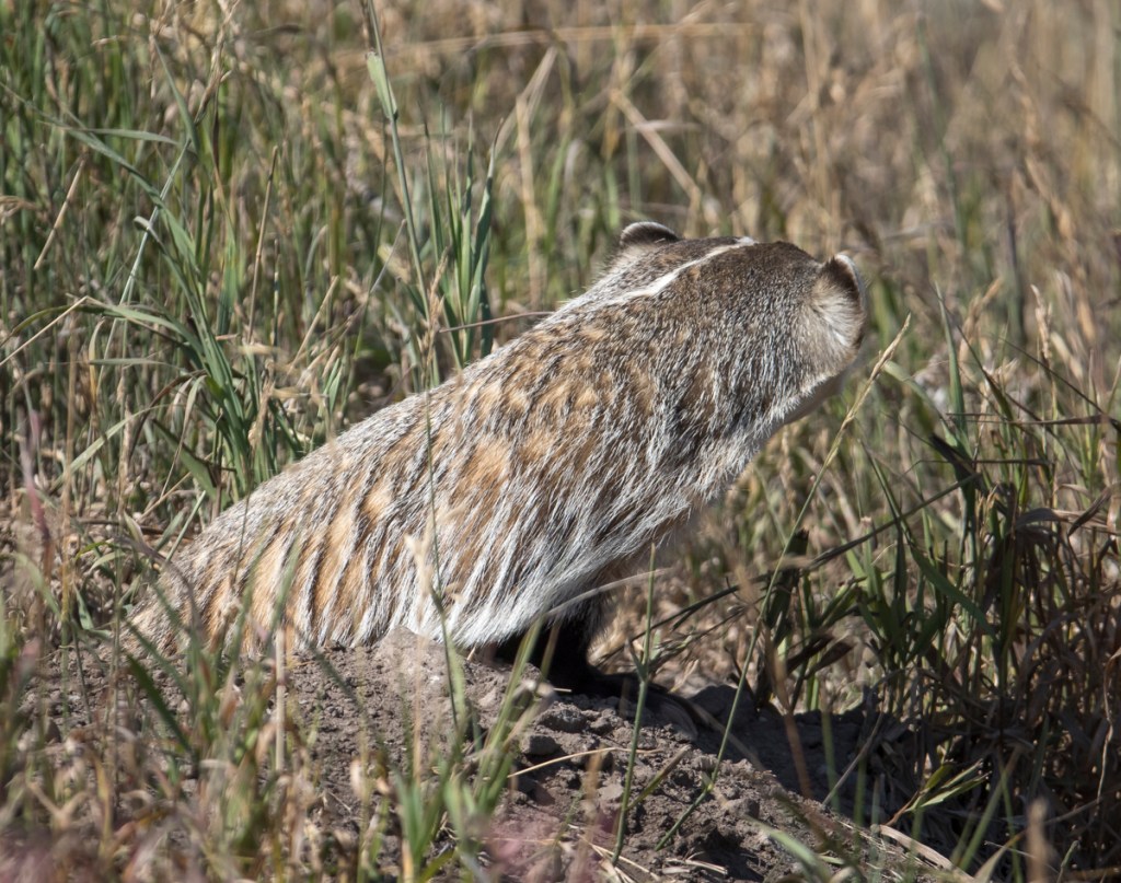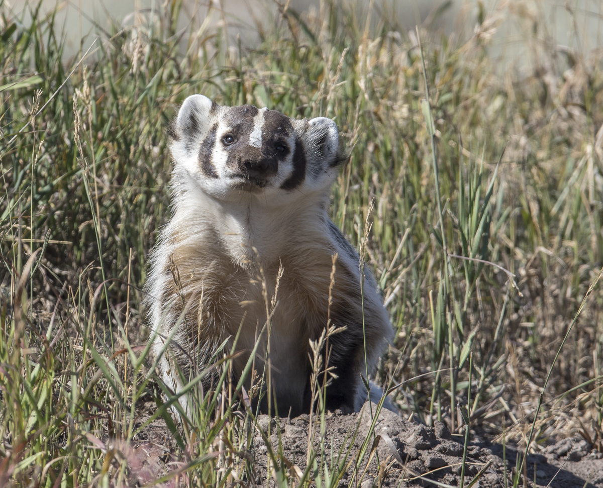 We didn’t want to cause a badger jam (attract others to stop and disturb the badger) so, when we heard a car approaching, we would put our cameras down and pretend to be taking selfies or landscape shots with our phones. As soon as the car passed, we would get ready, as the badger would soon pop back up, glance at us, then scurry out to hunt. We finally had to move on, leaving our furry friend alone in his beautiful back yard.