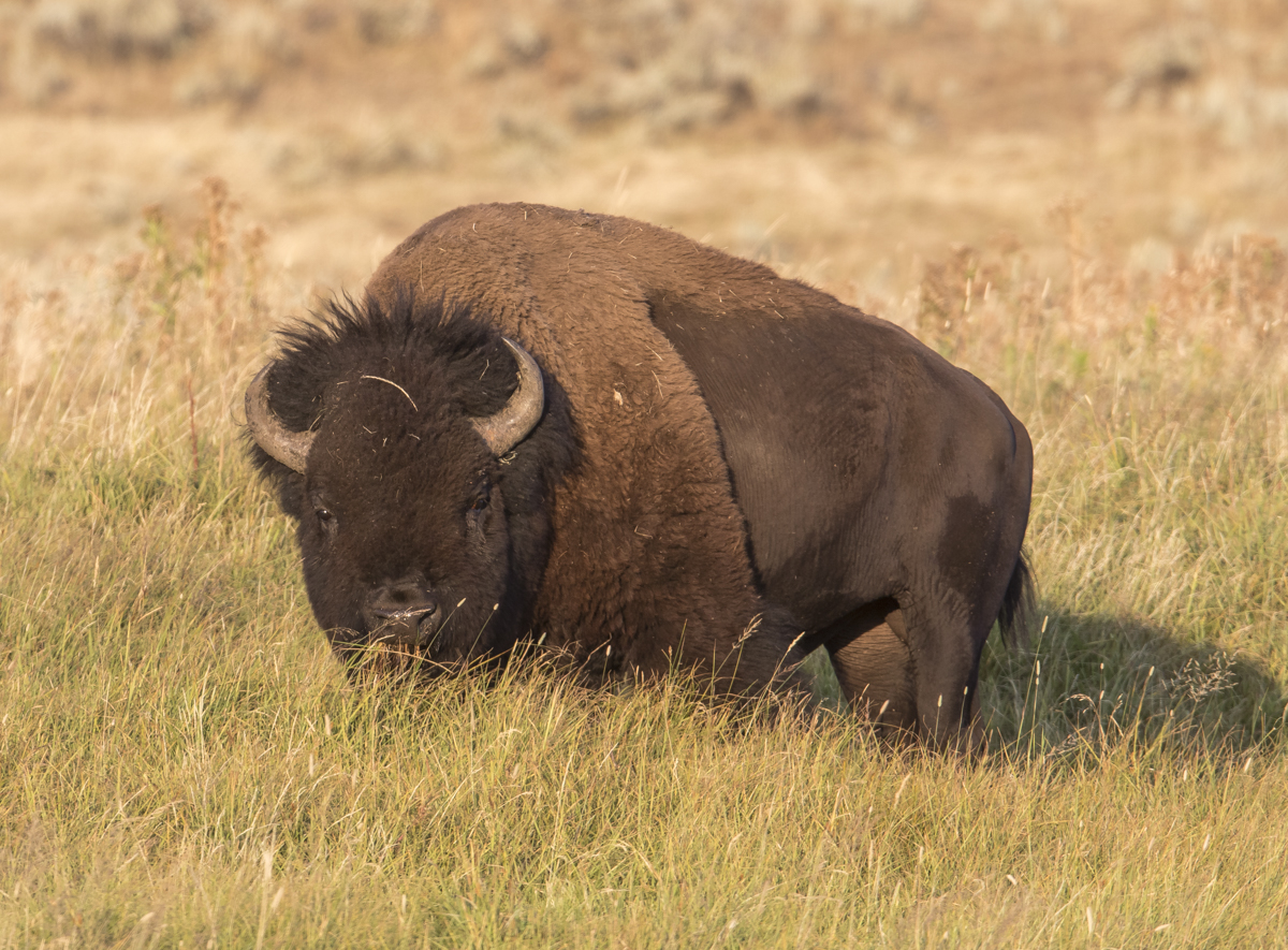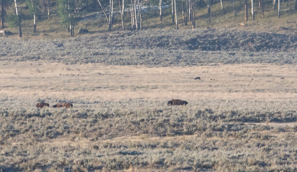 We opted for what we hoped would be a less crowded route on the 6-mile one way dirt road, the Blacktail Plateau Drive. Even that was crowded, but we got lucky, and at one point saw a badger run across the road in front of us. There wasn’t a car behind us so we pulled over and got out to see where it had gone. It had a hole right next to the road and had been digging, probably searching for aestivating ground squirrels, on both sides of the dirt road. While we were standing there, the badger poked its head out and stared at us, then retreated back into the burrow. We parked the truck, grabbed our cameras, and sat down a safe distance from the hole. We spent 30 minutes or so with this guy and watched as it would come out, check us out, then run across the road (out of our sight) to dig and then run back whenever it heard another car approaching. The fact that we sat still and didn’t stare at it the whole time seemed to put the badger at ease (maybe those two are just scrawny bison) and it soon paid us little mind.