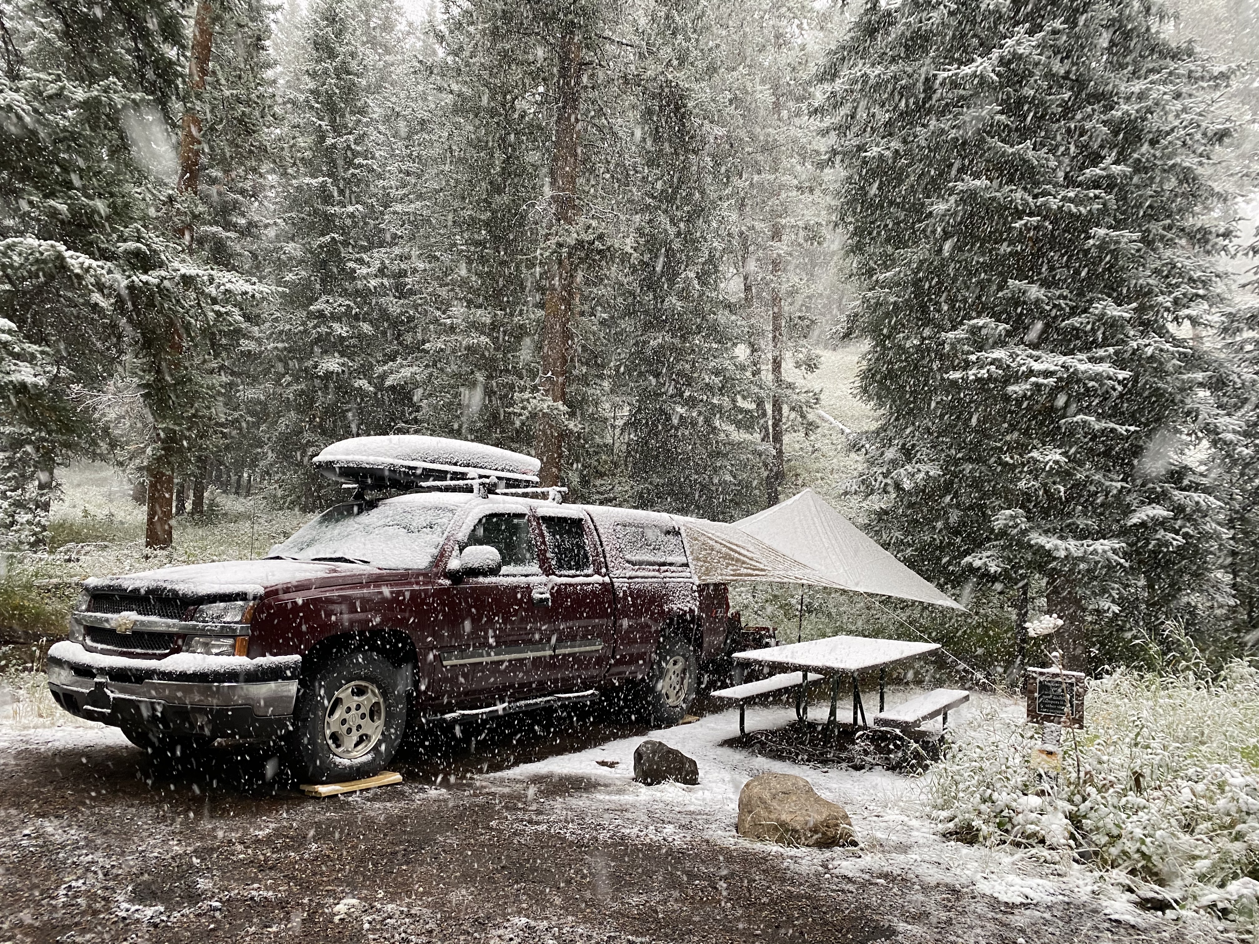 Now i know how most tourists feel that have only a short time in a park – so much you want to see and do, but you must keep moving. Our incentive was finding another camping spot for the night and there were a few forest service roads we needed to check out. The snowfall was heavier here and left lots of broken trees and mud on the formerly dusty roads. Luckily, we passed a forest service ranger driving in the opposite direction who kindly stopped to chat when I waved him down. He advised us to not head any further up this road as it was very muddy and some trees were down. He suggested we follow him to a nearby road he was going to check that had some marked dispersed campsites. That was a very lucky encounter as it no doubt saved us a lot of time and hassle, and the campsite we found proved to be not too shabby, especially the view!