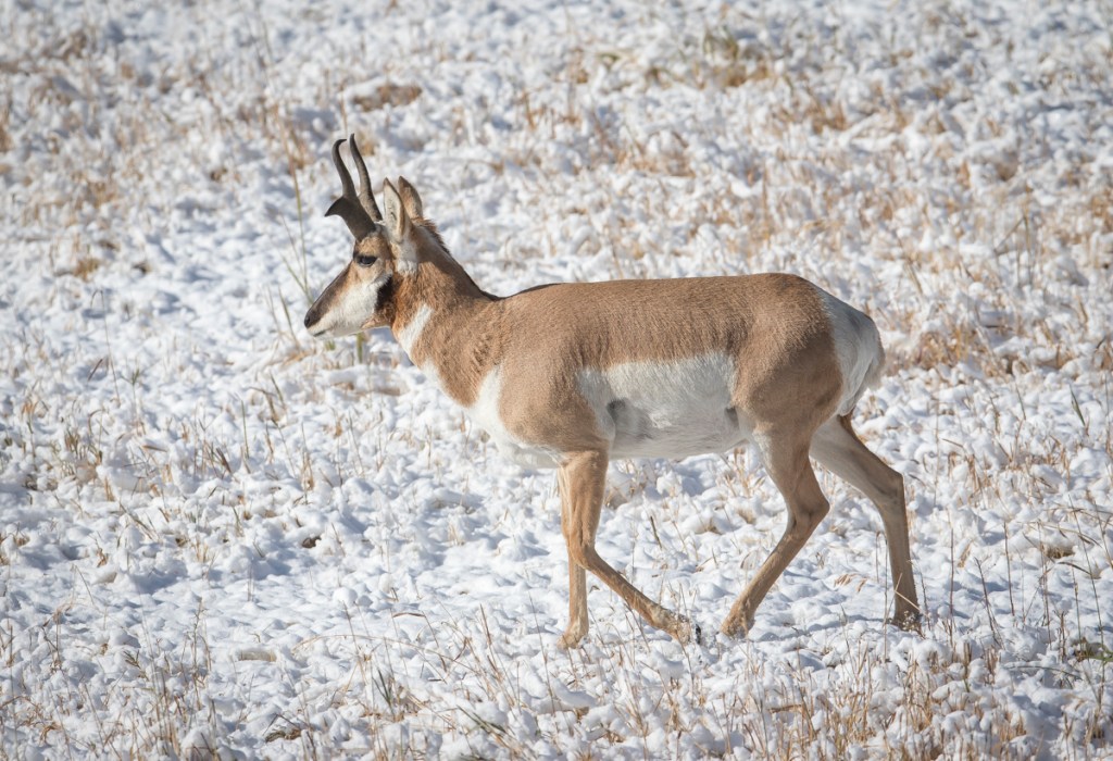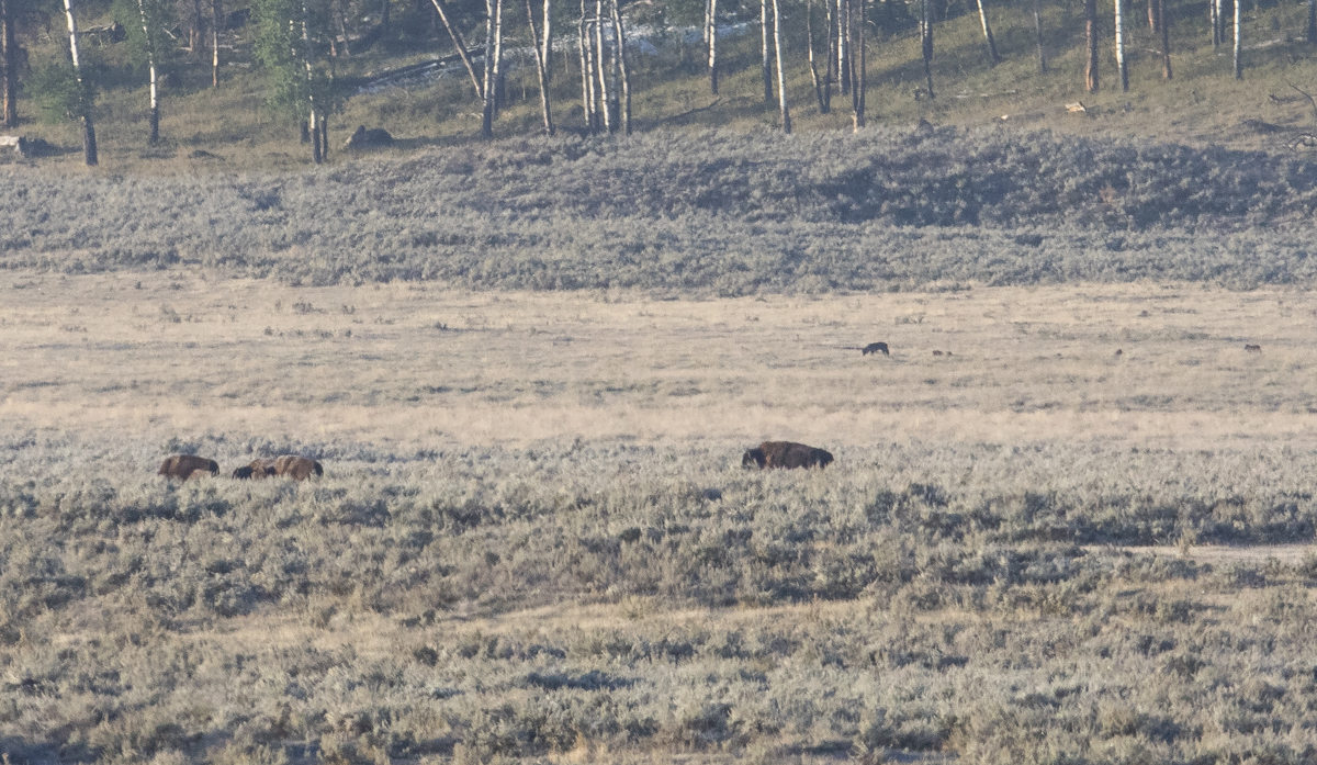There was about 2 inches of snow on the ground and the temperature was 18 degrees as we drove into Lamar the next morning. What a change from the heat and humidity of home. Lamar was beautiful with fresh snow and the wildlife didn’t seem bothered. Th biggest change we saw was a group of Sandhill Cranes strolling in the flats of the valley flipping buffalo chips (poo piles). There is a large community of invertebrates associated with buffalo scat and several species (I have seen Yellow-headed Blackbirds, Clark’s Nutcrackers, and Ravens) will flip over the drying chips looking for an insect snack. The cranes methodically made their way through the garden of chips, flipping them over, and occasionally pecking at something underneath.