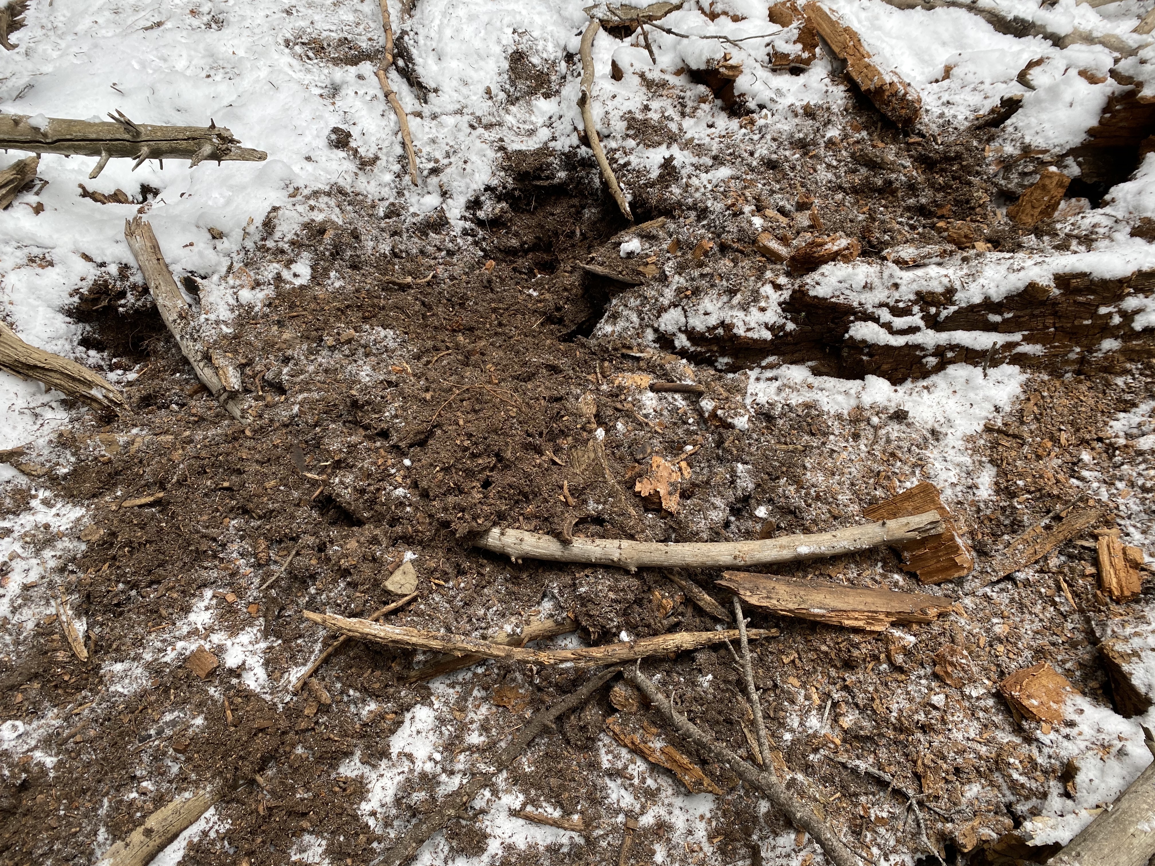 The area around the midden was dug up in several places and one camera had been jostled by something, knocking it loose from its strap. When we got back to the car, we played the cards on the laptop and got footage (you’ll have to wait for his film) of both Black Bears and Grizzlies digging up the cones. And there were fresh Grizzly tracks in the snow!