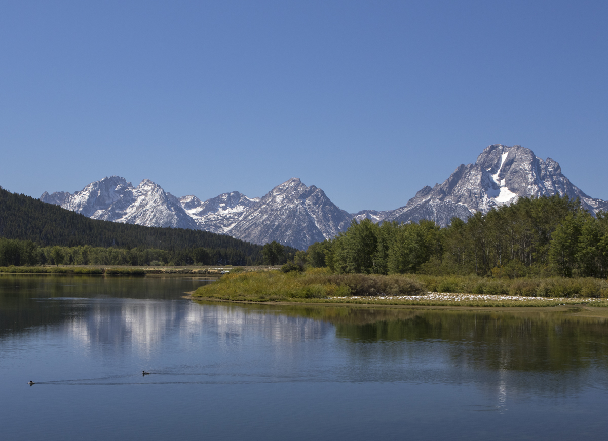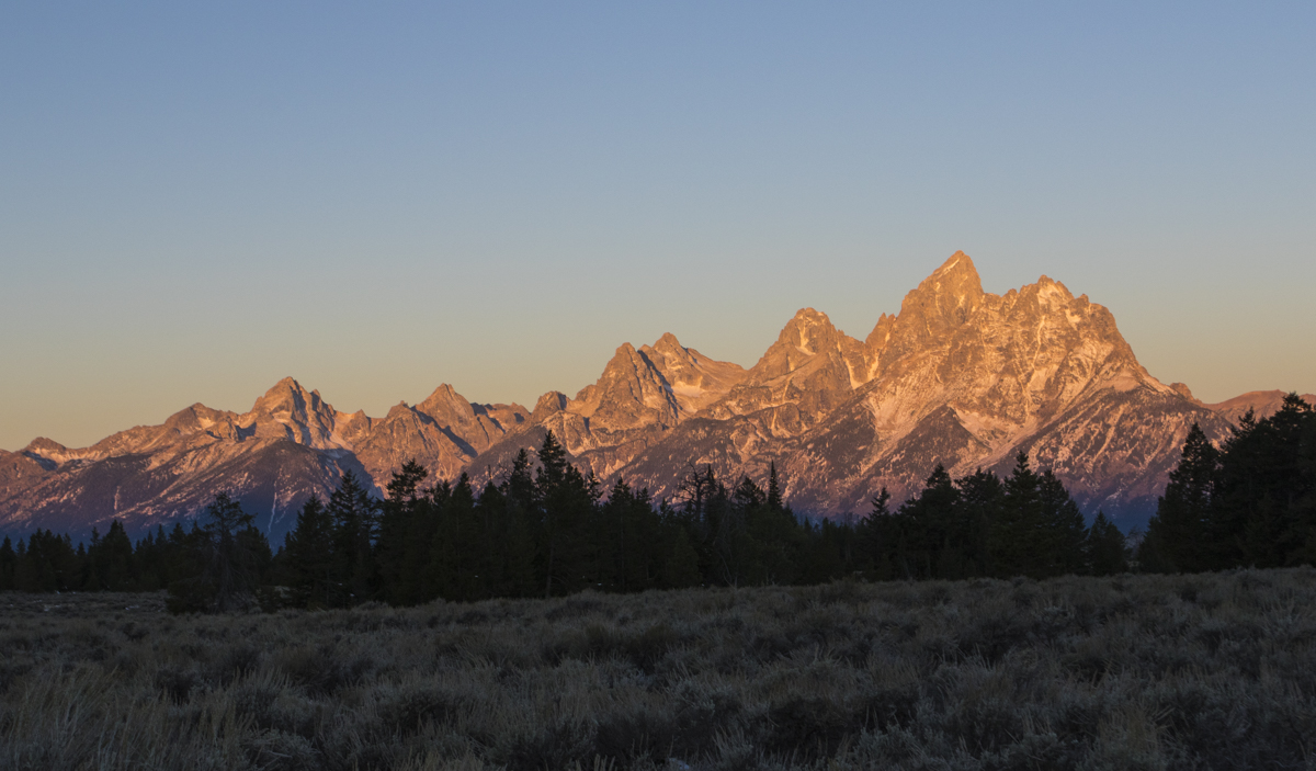 The next morning was cold (15 degrees) and clear as we drove south through Yellowstone headed for Grand Teton National Park. I love Yellowstone, but the Tetons are certainly one of the more majestic landscapes I have ever seen. The Tetons seem to jump out of the flat sagebrush plains that surround it and reach for the heavens. There are 8 peaks over 12,000 feet in this range which stretches about 40 miles. One of the most iconic views is from Oxbow Bend, an old meander cut off from the nearby Snake River. We passed through mid-afternoon (it is best viewed at sunrise and sunset) and crowds were lining the pull outs enjoying the scenery and perhaps hoping for a view of the park’s iconic Grizzly mama, #399, and her four cubs. There were large flashing road signs warning drivers to use caution as this zone is a bear crossing area (never seen that one before). By the way, 399 is probably the most famous bear in the world and has her own Facebook and Twitter accounts!