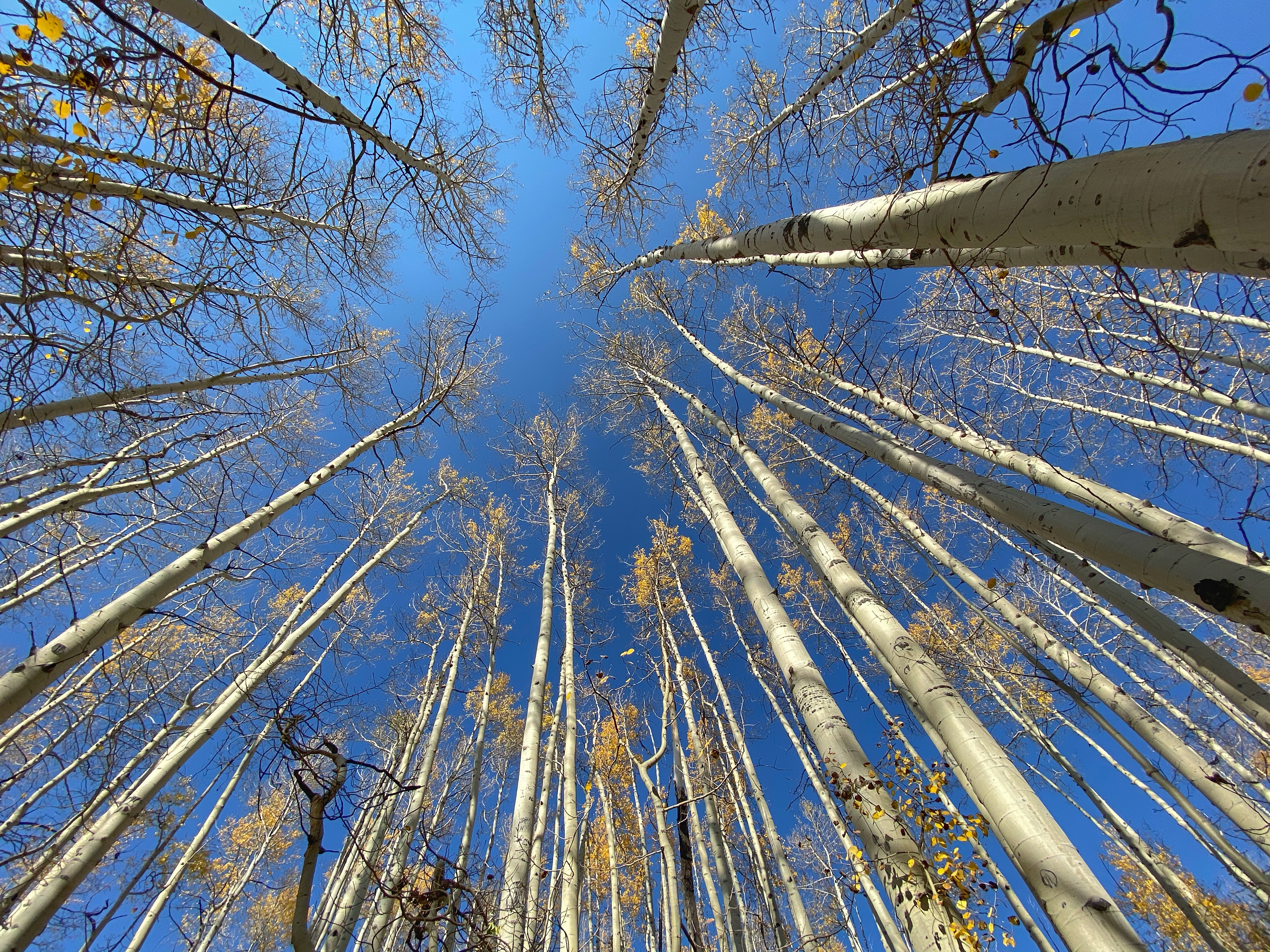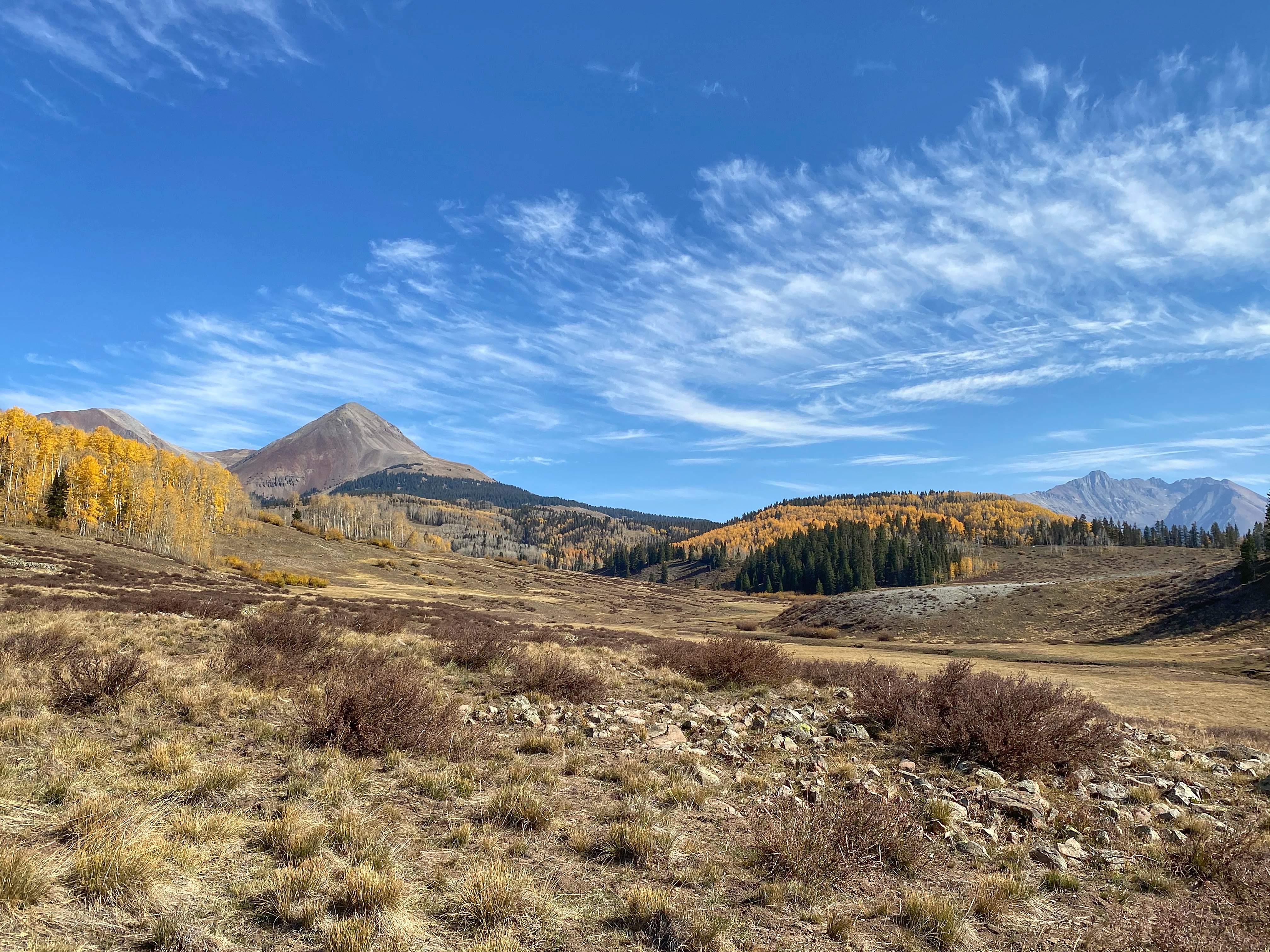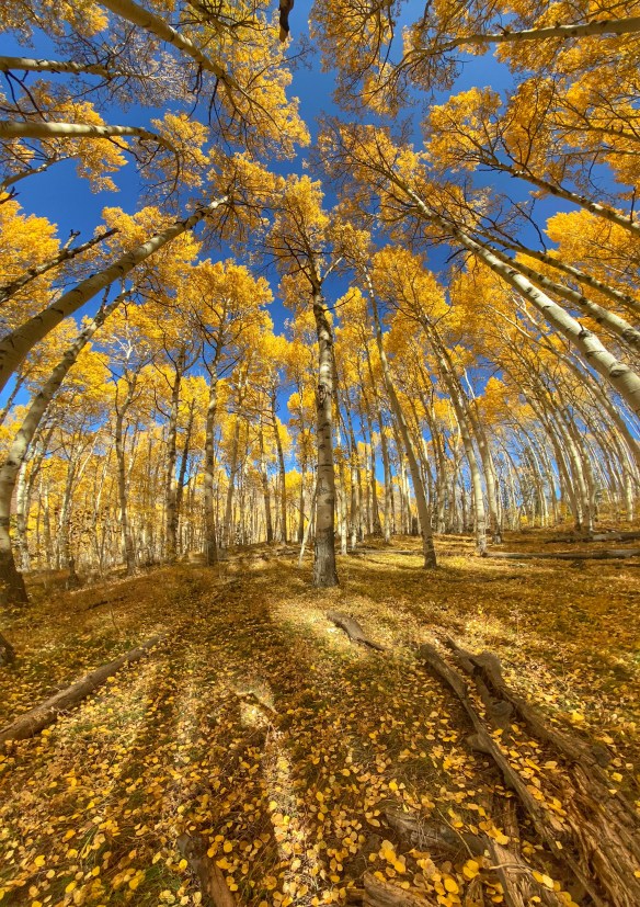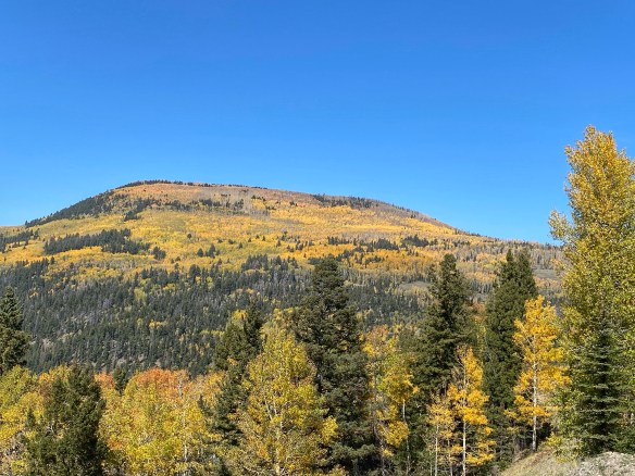 Our next stop was a beautiful area in the Rio Grande National Forest. We drove some back country roads looking for an isolated site but there were a lot of large RVs with 4-wheelers scattered throughout the valley along the creek. So, we took one of the high roads and found a pullout with a view through the trees of a nice peak with golden aspens illuminating its lower slope.