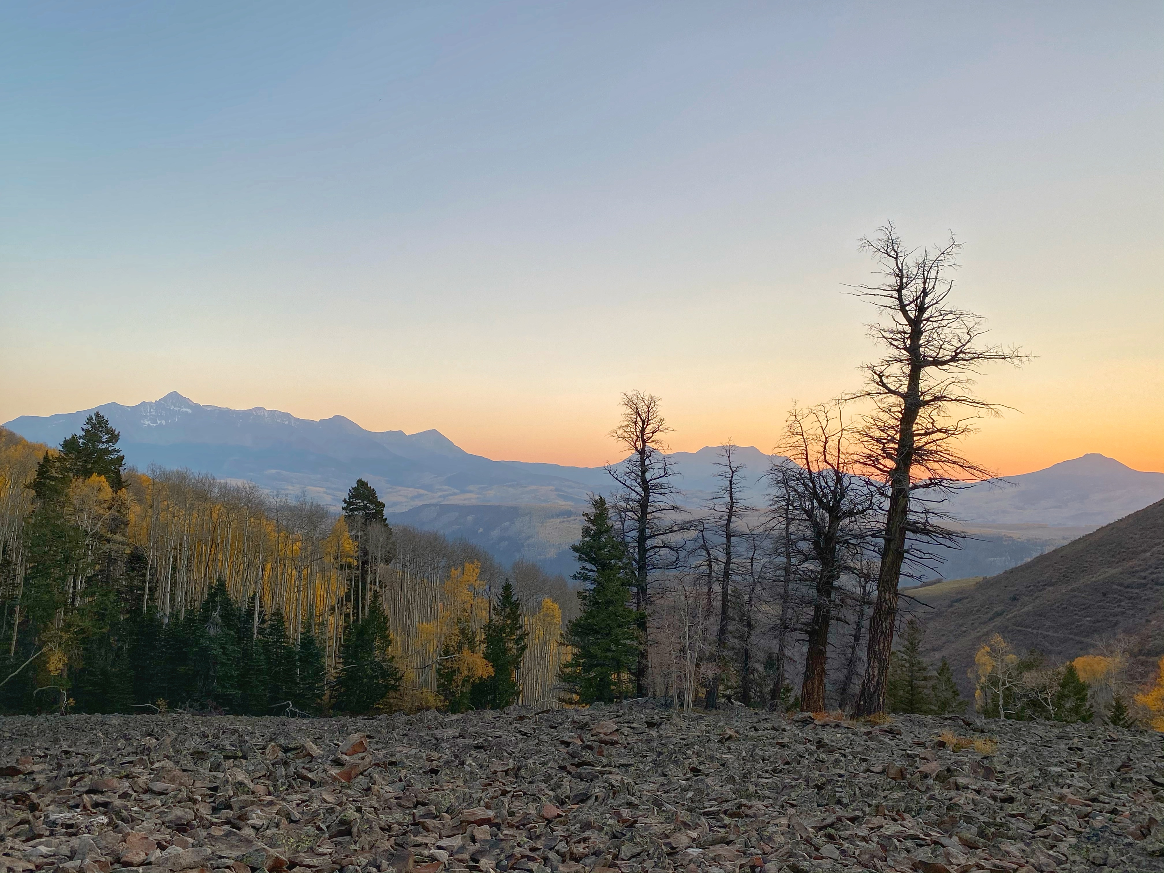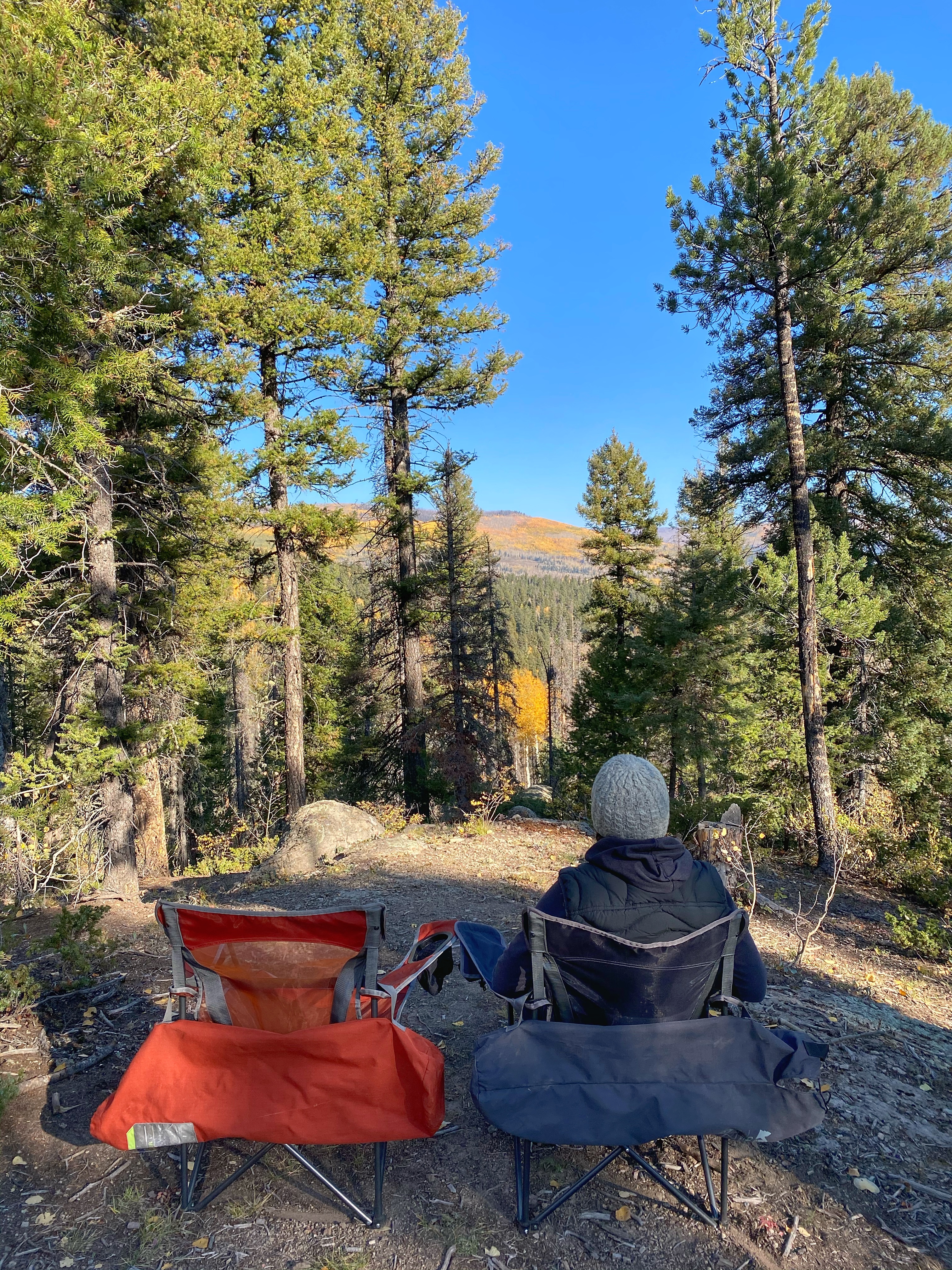 All along the road were groves of beautiful aspens in their prime fall colors. And there were lots of people out enjoying it and camping in the best spots. We kept going, hoping for a place with a view. We came through a pass and then headed down what was the steepest dirt road I have traveled and eventually popped out to an opening in the trees with a wonderful vista of distant mountains. People had obviously camped here before even though it was basically just a flat spot on an expansive talus slope. There was a small area at the edge that had solid ground and some trees where we set up our table and chairs. Like most of our campsites thus far, the talus slope was above 9000 feet in elevation, so temperatures dropped quickly as the sun slid beneath the peaks.