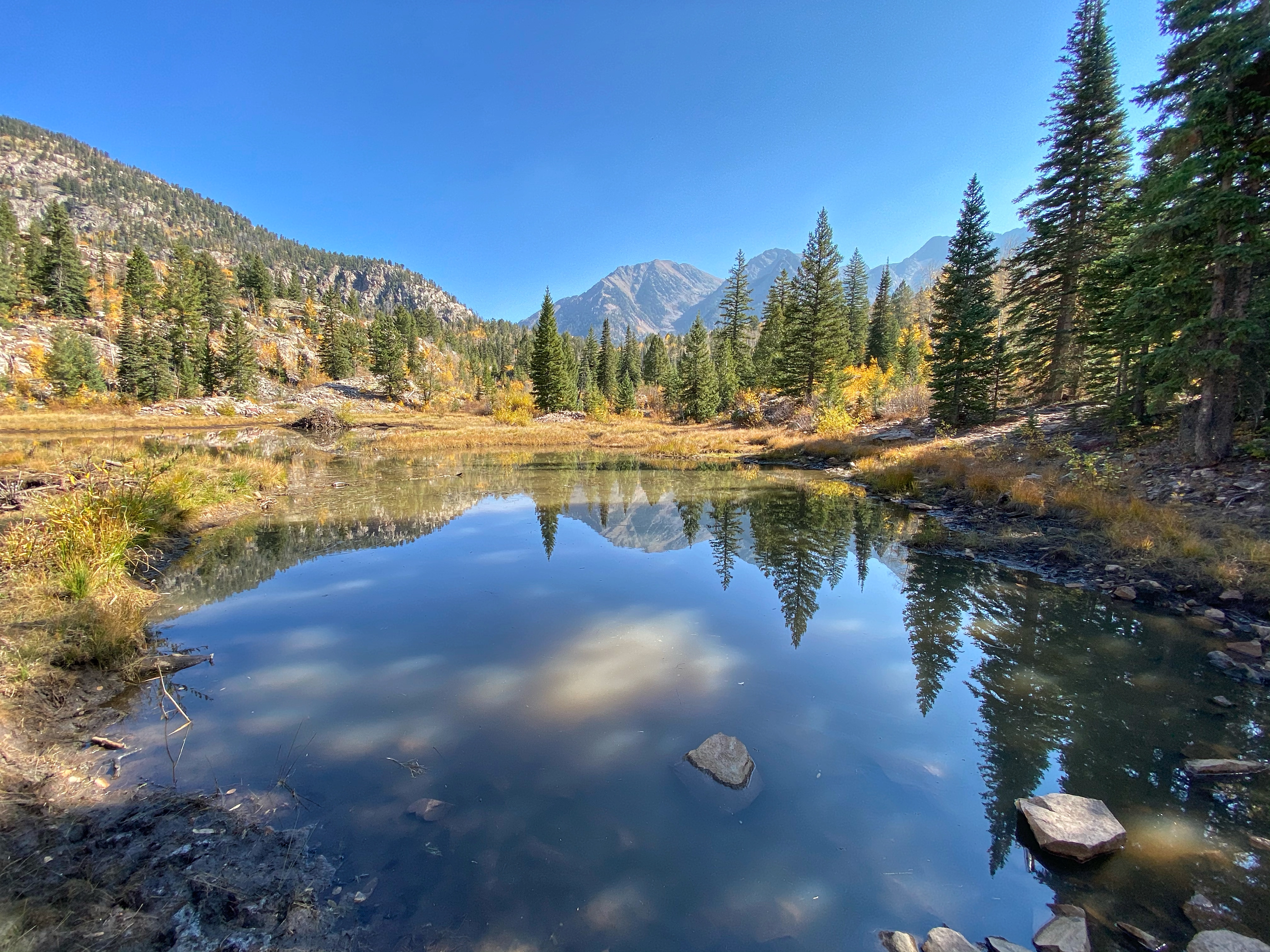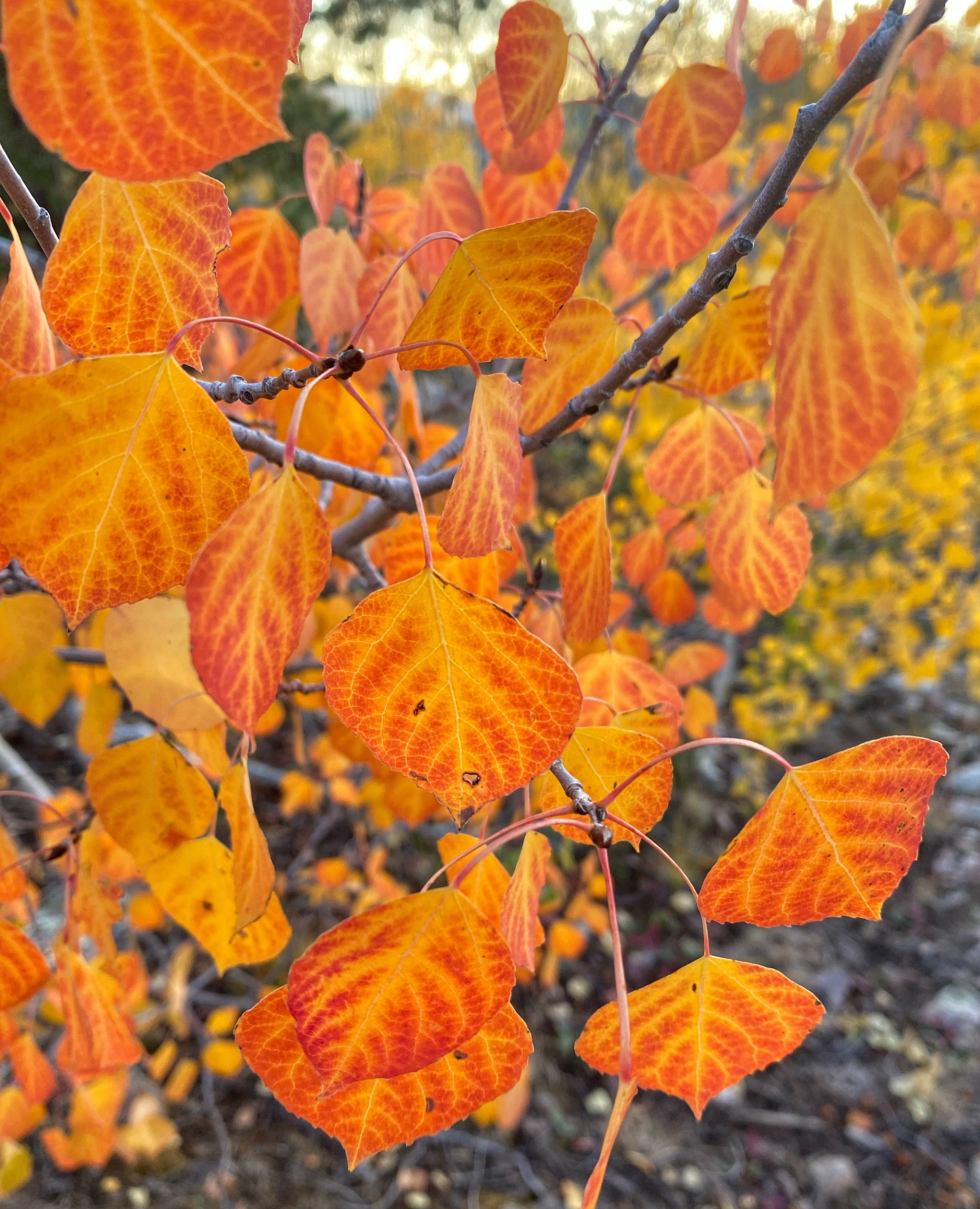 After passing through Durango, our route entered the San Juan Mountains and the glorious golds of fall aspens were a constant. Melissa steered us to what turned out to be one of the rockiest roads I have ever been on, Old Lime Creek Road, in San Juan National Forest. At about 3 miles we passed a small trailhead to Spud (actually Potato, but the locals call it Spud) Lake. We passed by hoping to find a secluded campsite and paused to ask a vehicle coming the other way about road conditions farther along as I was beginning to squeeze the steering wheel a bit too tightly. The driver, a local, said the road got worse and was mainly one lane with few good places to turn around. That convinced us to look for something back behind us. We both wanted something special since it was Melissa’s pre-birthday night campsite. We passed a small side road with huge ruts from when the area had been muddy. Melissa walked down it as I walked ahead on the main “road”, looking for a site. When we got back together, she thought we could make it past the giant ruts and camp in a grove of aspens on the side road. We carefully pulled in and set up camp and climbed a short hill above our site to a rock outcrop with a fabulous view of the surrounding peaks. This would do, indeed it would. The sunset and sunrise were fabulous and everything was perfect except for the mice that invaded our truck cab during the night. For some reason, this was the trip of the mouse, with several mice coming into the cab at night over the first several campsites…as much as I hated doing it, we ended up catching 5 mice total over several nights in a single trap I had brought along (the truck has had issues with mice ever since I accidentally left a bag of bird seed in it for a few nights in our driveway a few months ago).