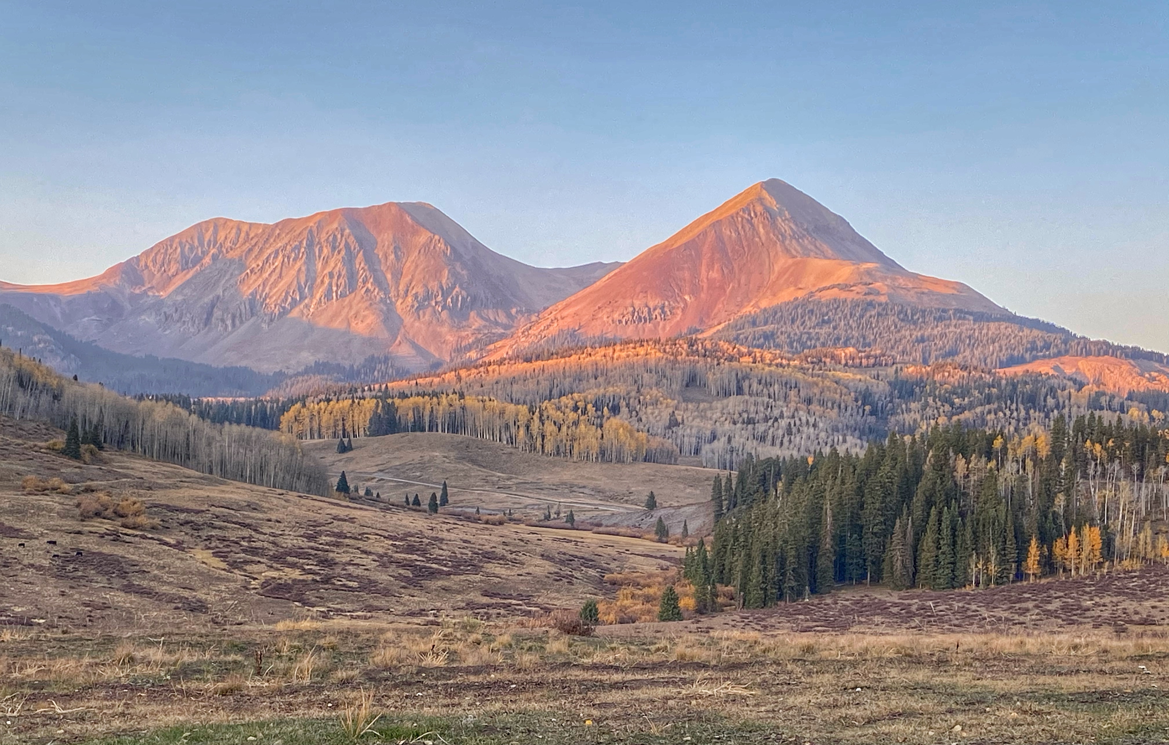 Next on our itinerary was a forest service road described as one of the most beautiful in the region – Last Dollar Road. Ironically, it runs through many vast private holdings where the ranches and homes look like their last dollar (if they even have one) is a couple of orders of magnitude greater than ours would be. Melissa spotted a young coyote hunting in the open near the road so we stopped and watched it catch a couple of rodents.