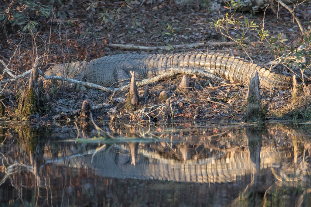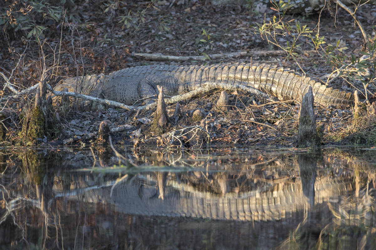 As we paddled back to the launch area, Melissa spotted a large Alligator basking in the late day sun. Floyd told us about the first confirmed Alligator sighting on the millpond back in 1996. Rumors of gators in the park had been around a couple of years, but, in 1996, a fisherman told Floyd he had seen one. In fact, he had caught it while fishing and had it in his boat (he didn’t know what to do with it and had brought it to shore hoping a ranger could help). After unhooking the ~3-foot gator, keeping it in an unused dog pen with a kiddie pool, and contacting wildlife officials, the decision was made to release it back into the millpond. There are now a few Alligators that call the millpond home, including one larger than the ~7-footer we observed.
