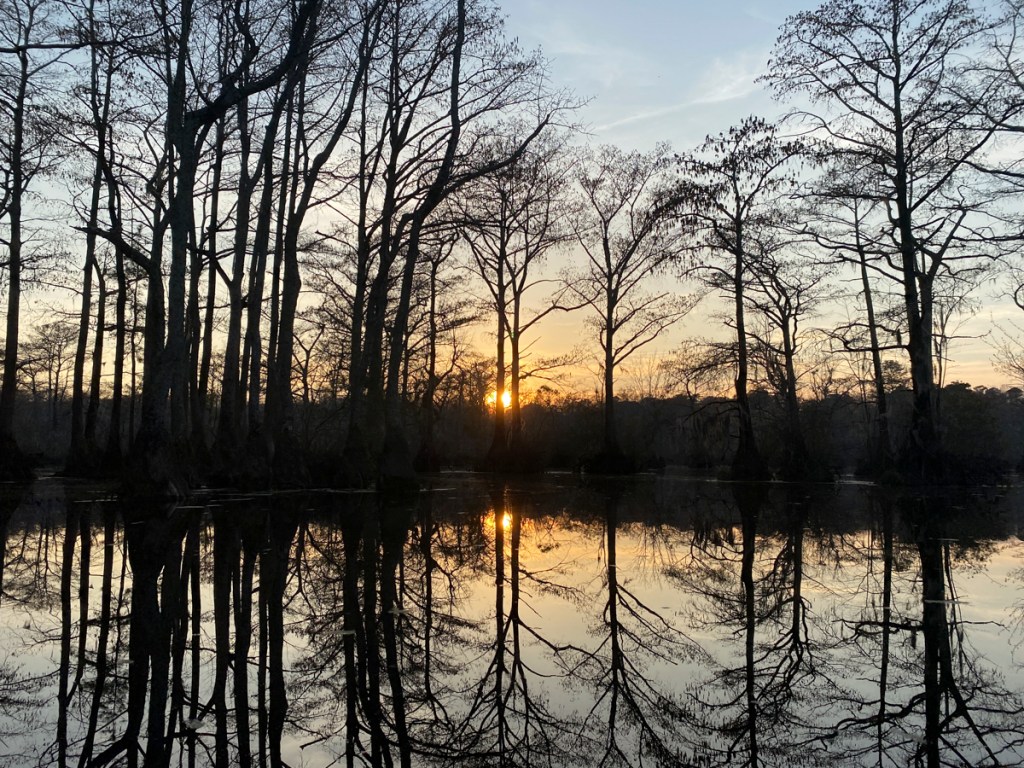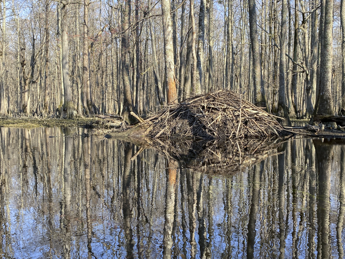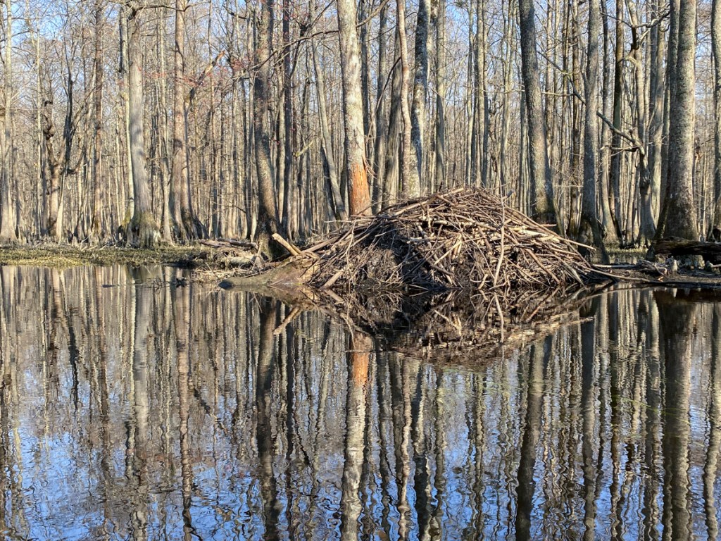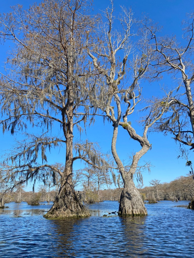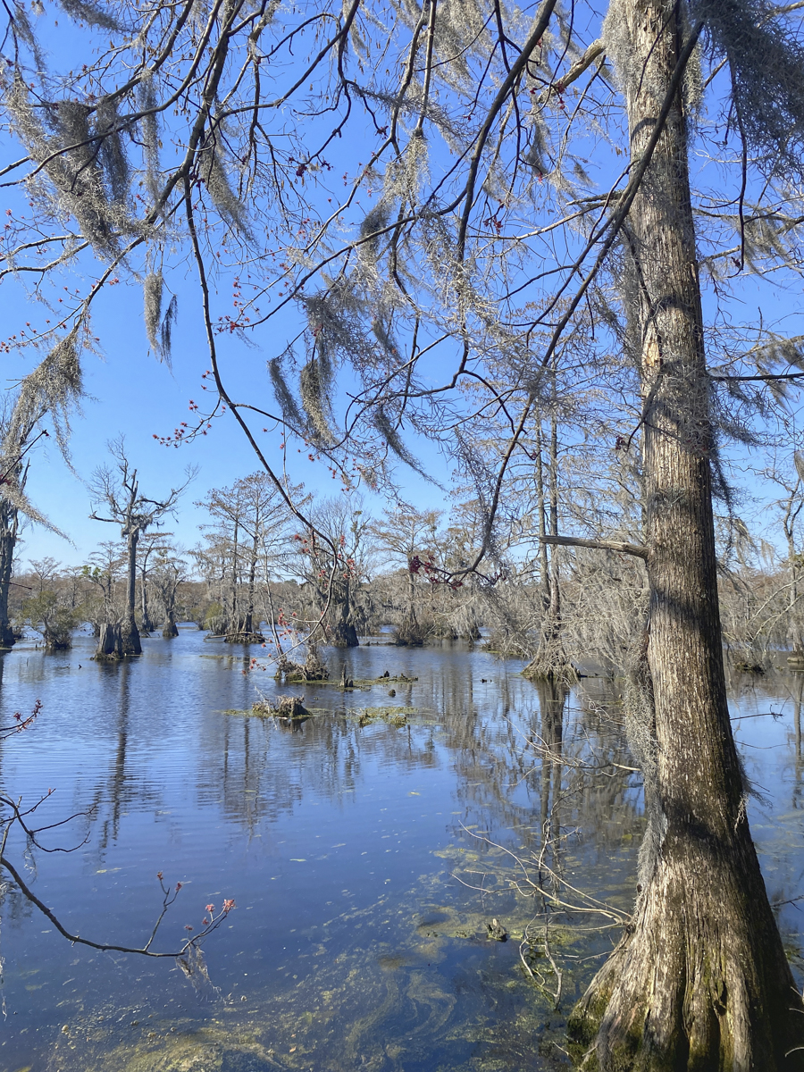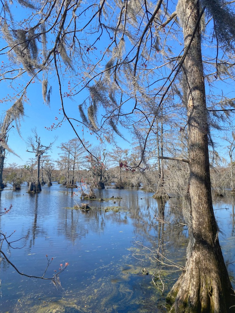 The 760-acre millpond is dominated by two tree species – Bald Cypress and Tupelo Gum. Stumps of ancient cypress cut in the 1800’s form islands of vegetation with Swamp Rose, Wax Myrtle and a host of other plant species. Spanish Moss is draped off most of the tree branches and Yellow Cow Lily (Spatterdock) is just starting to poke its leaves out of the water surface.