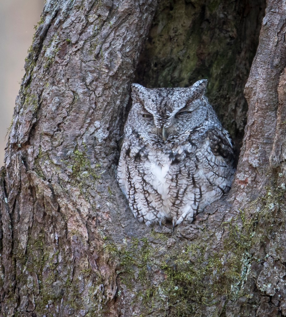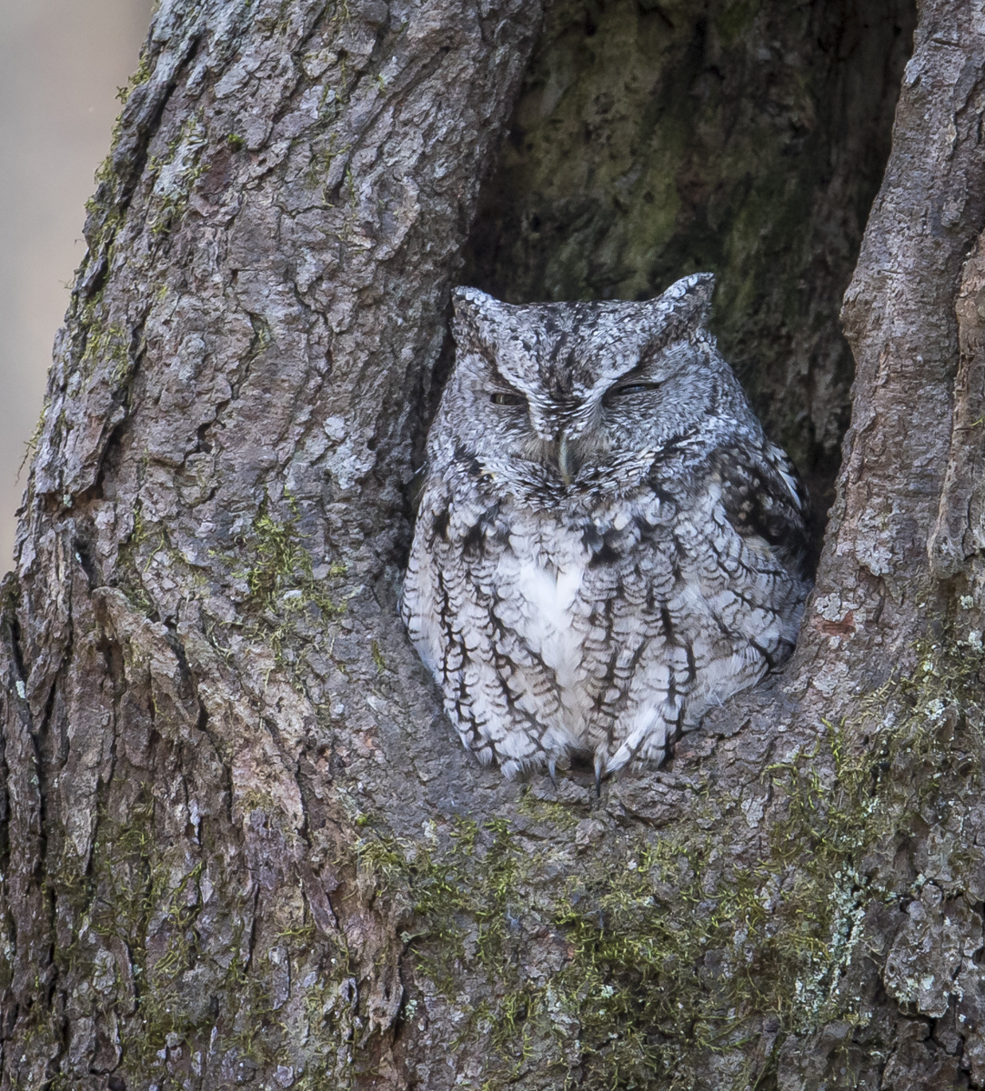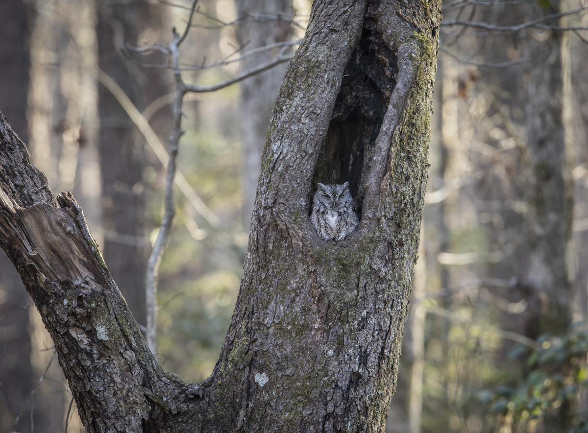 A highlight of the trip was one that did not occur on the millpond but on the uplands. Our friends shared the location of an Eastern Screech Owl roosting in a hollow tree, something I have been hoping to find for several years now (I have seen them, but only when I didn’t have a camera in hand). The owl did not disappoint. It is a gray phase (they can also be reddish in color) and has a perfect perch in the hollow of a tree. We checked the tree each time we drove in and out of the campground and it has a habit of disappearing down into the hollow and then reappearing so you never know when it will be visible. What a treat!