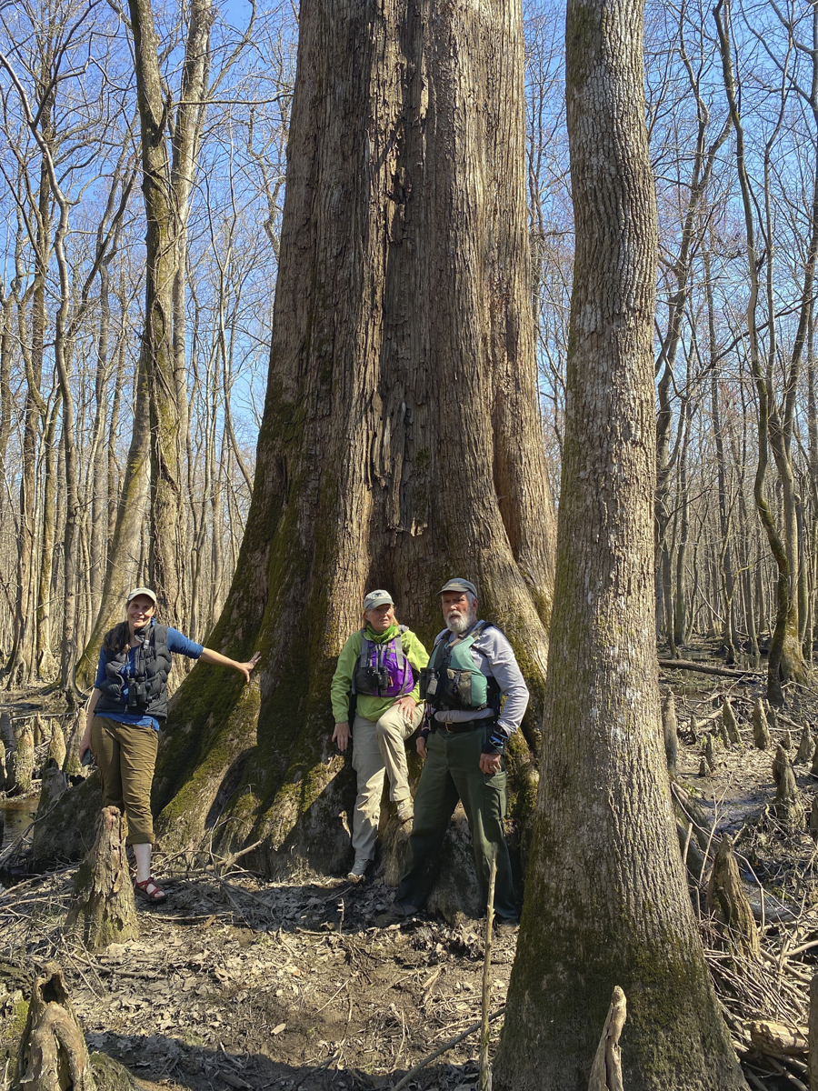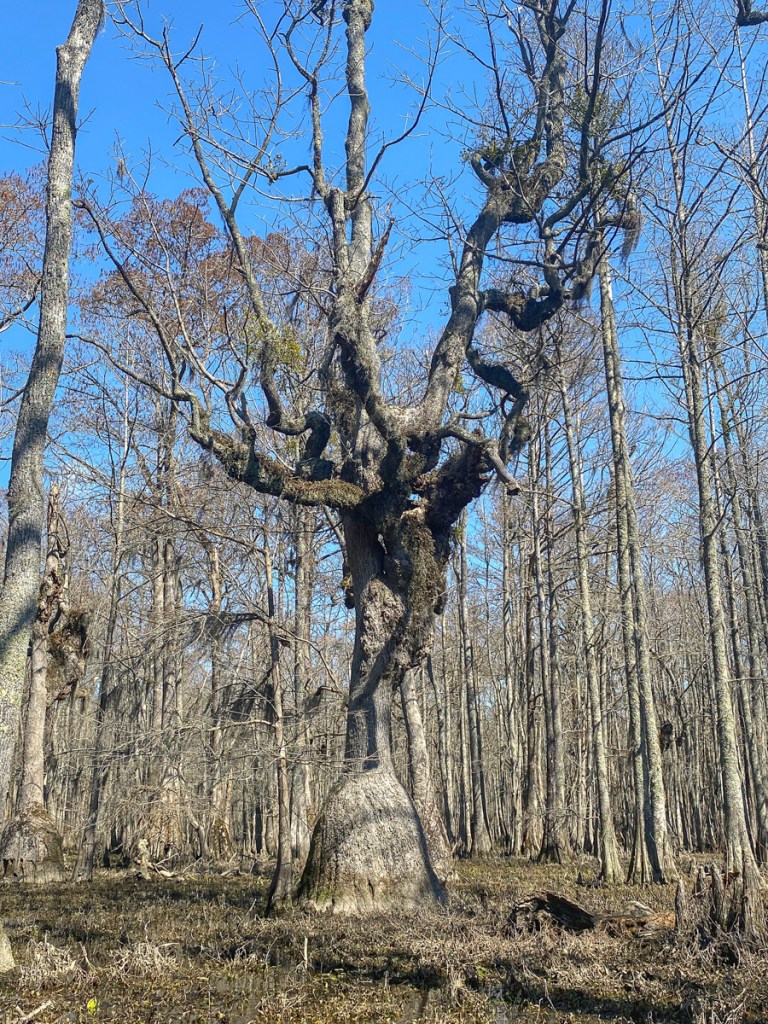 After a few hours of paddling, we started seeing some of the really big Bald Cypress scattered about the upper end of Lassiter Swamp. One of the big ones I remembered climbing inside years ago (9 people could stand inside the hollow base of the giant) had fallen victim to Hurricane Isabelle and lay covered in moss along the creek bank. But the matriarch of the swamp is still standing. This cypress was aged by the team that designated those well-known cypress along the Black River as the oldest known trees in the Eastern United States (one has been dated to be at least 2,624 years old). This tree is much larger than those on the Black River due to the nutrient-rich waters of this swamp and is estimated to be at least 1000 years old. It is humbling to stand next to one of these giants.