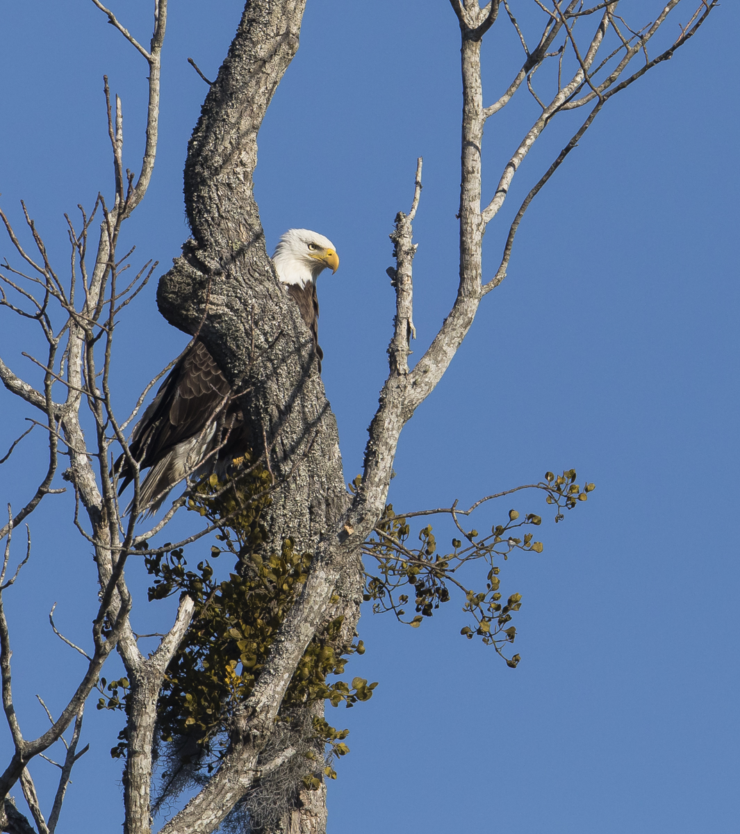 On my last trip by the nest tree, the male eagle flew in and perched nearby, giving me the side eye from behind a tree trunk. I paddled on not wanting to disturb them.