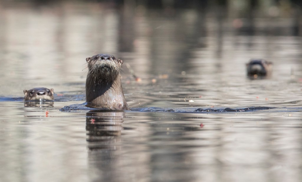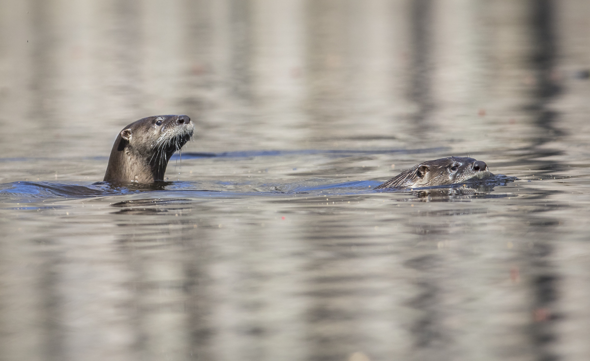 I passed the Raccoon tree and found it empty, but there were plenty of birds and signs of animals (otter scat, beaver lodges and cut trees, raccoon tracks in the mud) as I paddled. Finally, I saw a swirl in the water along one side of the creek and then some movement – otter! I stopped paddling and slowly drifted with camera in hand as the four River Otter realized there was something in their creek and swam out to get a better view. They bobbed up and down, snuffing and snorting as they tried to figure me out. I never got all four in the same field of view at once, but it was great spending a few minutes with these aquatic acrobats. They finally had enough of me and headed upstream.