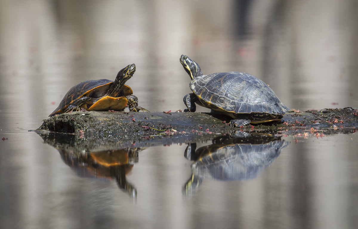 Turtles were basking on almost every log on Thursday (note the very long front claws on the male turtle on the left – used during courtship to stroke the necks of females)