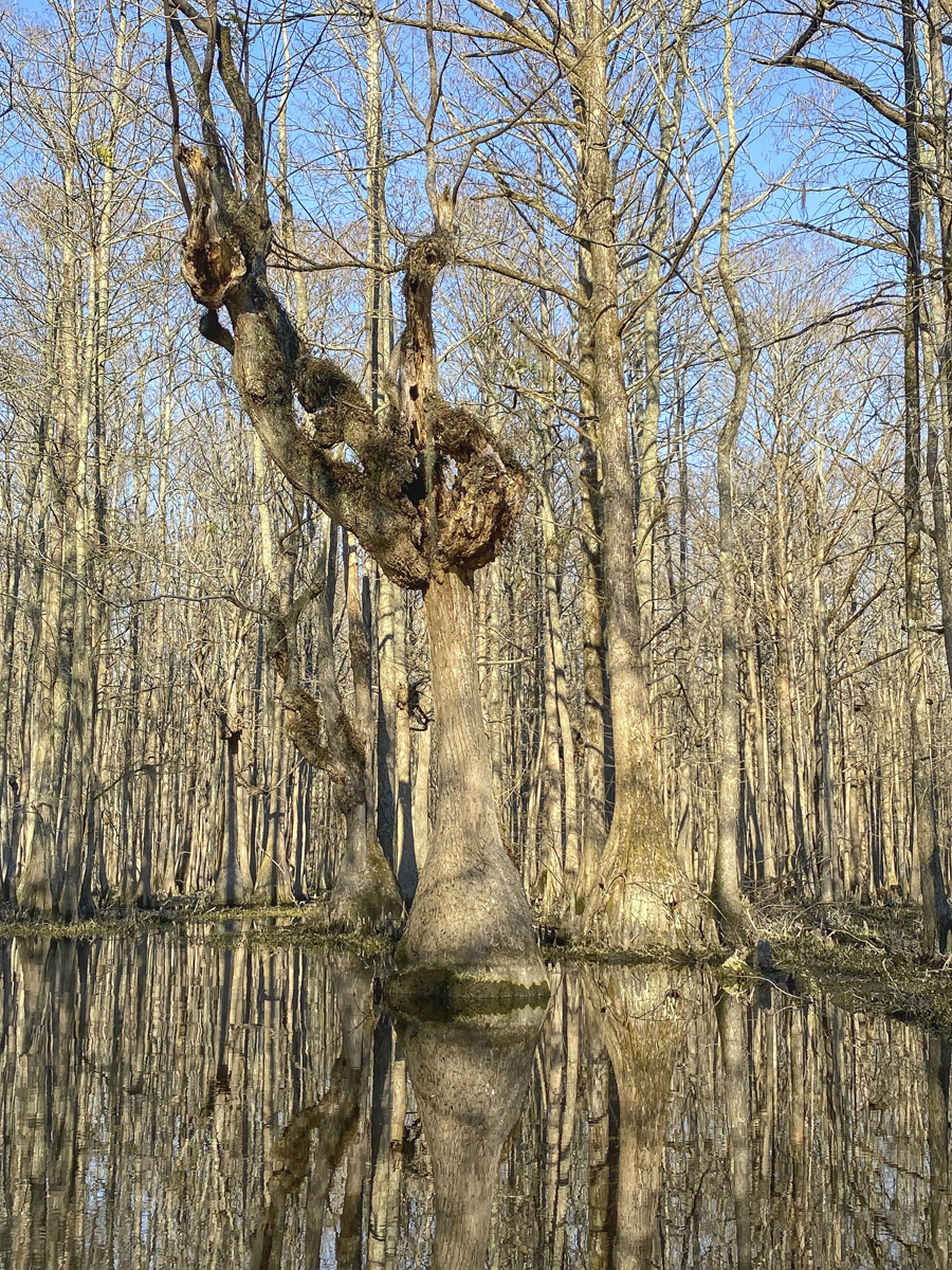 Paddle to the far end and you enter an entirely different world – Lassiter Swamp. The channel narrows and winds through a maze of gnarled Tupelo Gum that have been transformed into gargoyle-like shapes by Mistletoe (a semi-parasitic plant that causes the gum trees to create odd growths as they forms “scar tissue” in reaction to the Mistletoe’s intrusion). So many trees have been disfigured by the Mistletoe that the entrance to the swamp is known as “the enchanted forest” by locals.
