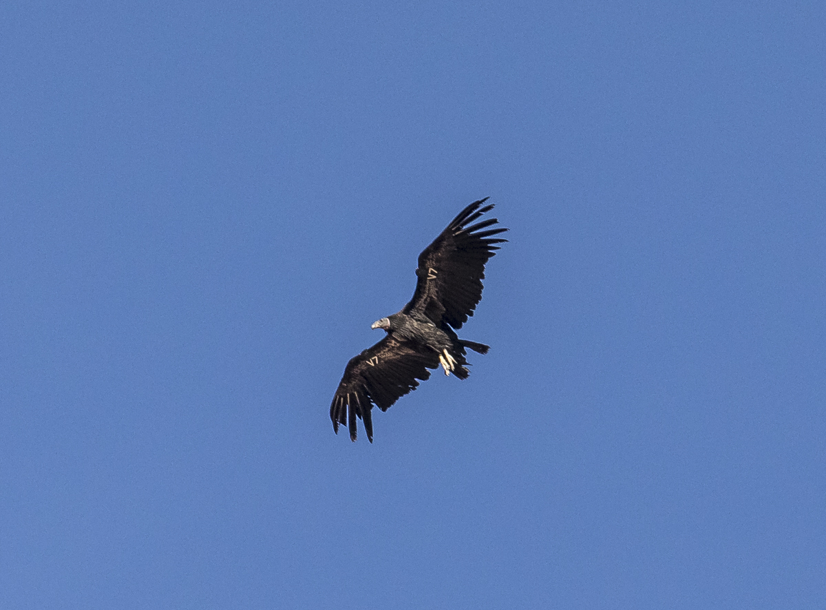 This bird soared beneath me with a clear view of its tag, #12. This bird is a female, hatched in 2016. She is attaining the pink skin on the head and has started to develop the white under-wing patches.