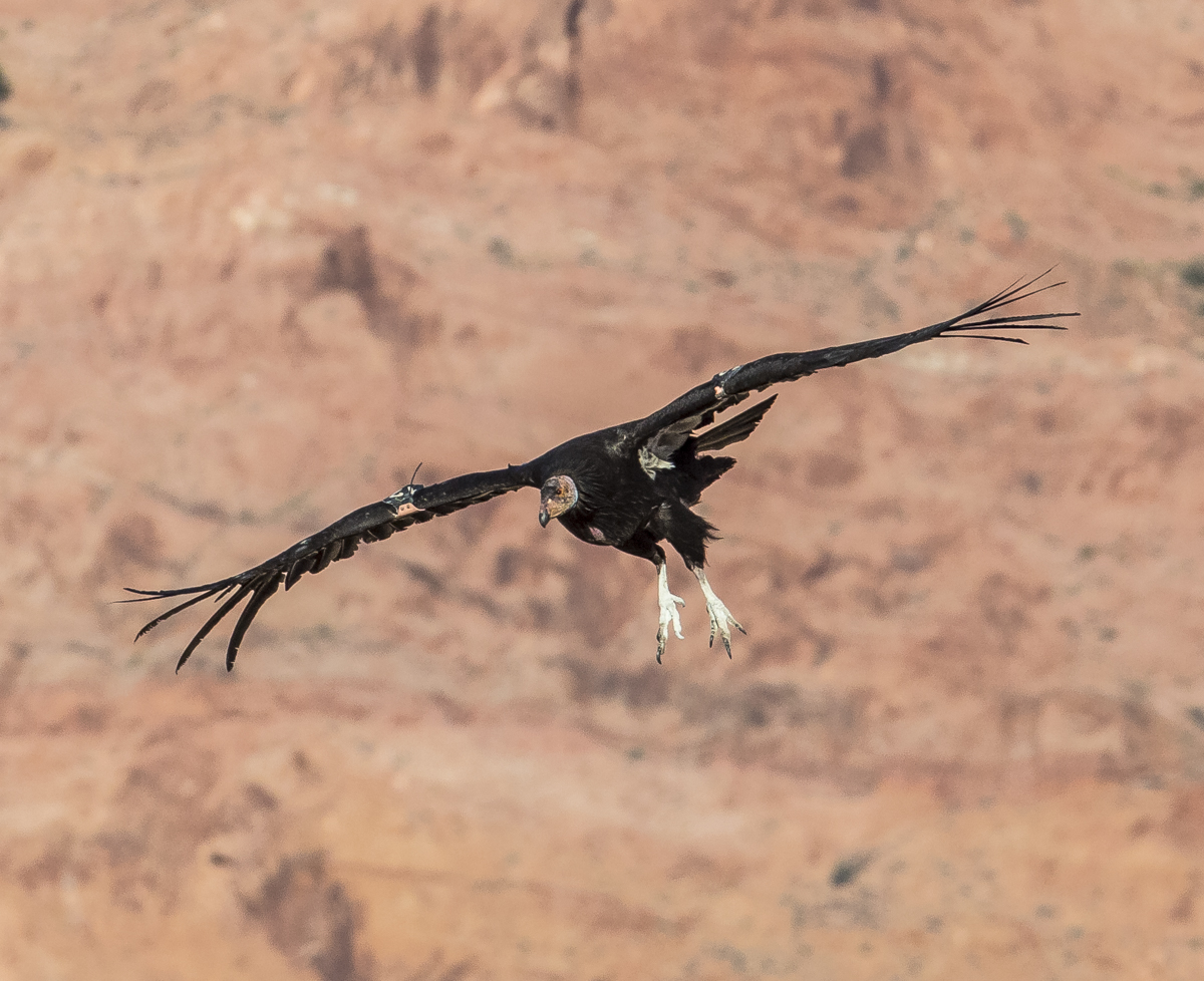 The California Condor is North America’s largest land bird, weighing up to 25 lbs and having a wingspan of almost 10 ft. It is critically endangered and became extinct in the wild in 1987 when the known remaining 22 (or 27, depending on which reference you use) birds were captured for a captive breeding program aimed to help recover the species. Captive reared birds started being released back into the wild in 1991, and today, the condor population numbers over 500 birds, with around 300 flying free in California, northern Mexico, Utah, and Arizona. One of the release sites is the Vermilion Cliffs Wilderness adjacent to the Navajo Bridge. Condors prefer steep cliffs for roosting and nesting so they can launch their huge bodies into the air, and online reports mentioned they also roost on the bridge structures in this location. So, we arrived close to 5:30 p.m. and started watching and waiting. Melissa walked across the bridge and saw a woman with binoculars and a camera and struck up a conversation. She was there for the condors as well, and assured us they would be there at some point this evening. We kept scanning the canyon, expecting to see them fly in from one direction or another, but only swifts and an occasional hawk flew by. After about 30 minutes on the bridge I looked over and saw the woman with binoculars walking toward us pointing up into the sky. I turned and looked straight up, and there it was, a condor! It dropped rapidly as if descending from heaven (Melissa commented that she understood how many Native Americans incorporated this giant bird into their mythology with this type of grand appearance) and soared underneath and landed on our bridge. Over the next few minutes, three more condors came in, one landing on the bridge and two more on the cliffs.