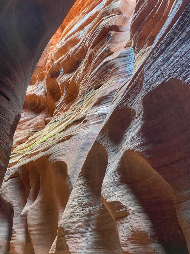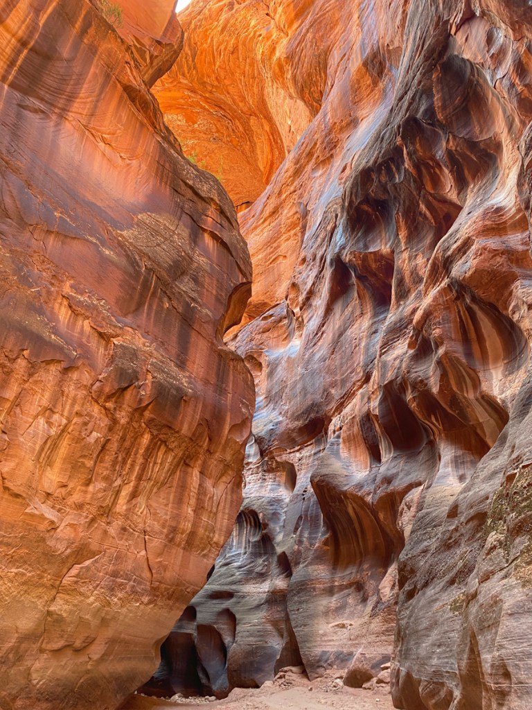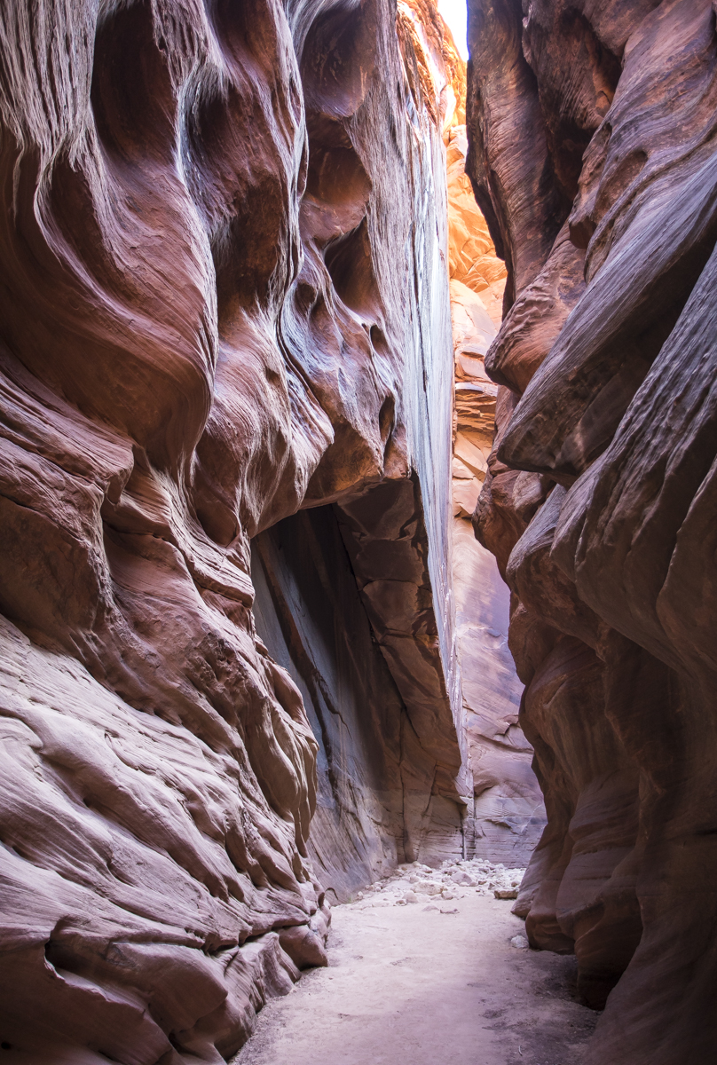 After entering the narrow slot, you are immersed in a fantastical world of swirls, lines, and light. We soon realized that by arriving early, we had avoided many of the people that do this popular day hike, so we had long stretches of the slot canyon to ourselves. After a mile or so, you reach a more open area that is the juncture with the Buckskin Gulch slot canyon. You want to take the trail to the right to continue down the more narrow slot canyon.