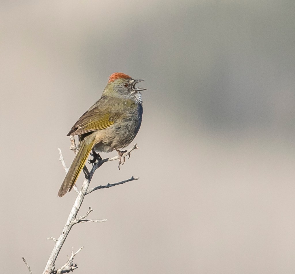 A less cooperative resident was a new species for me, a Green-tailed Towhee, that was singing from s small shrub snag until I would try to approach for a photo. We noticed a pattern in its behavior – shortly after I would retreat, the bird would return to the same snag and start singing again. So, I finally just sat down at a distance and heavily cropped the image you see below.