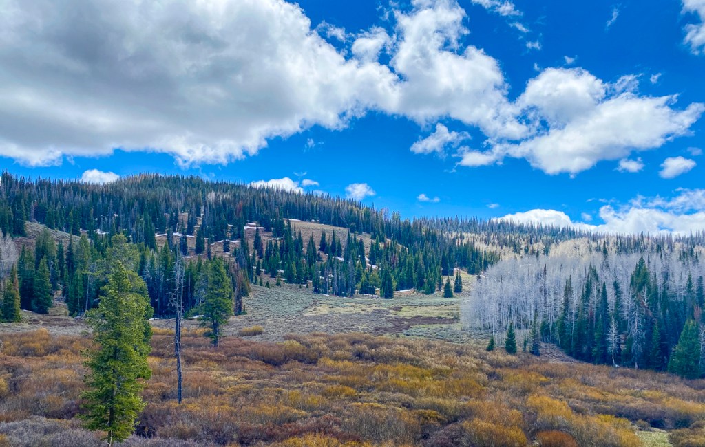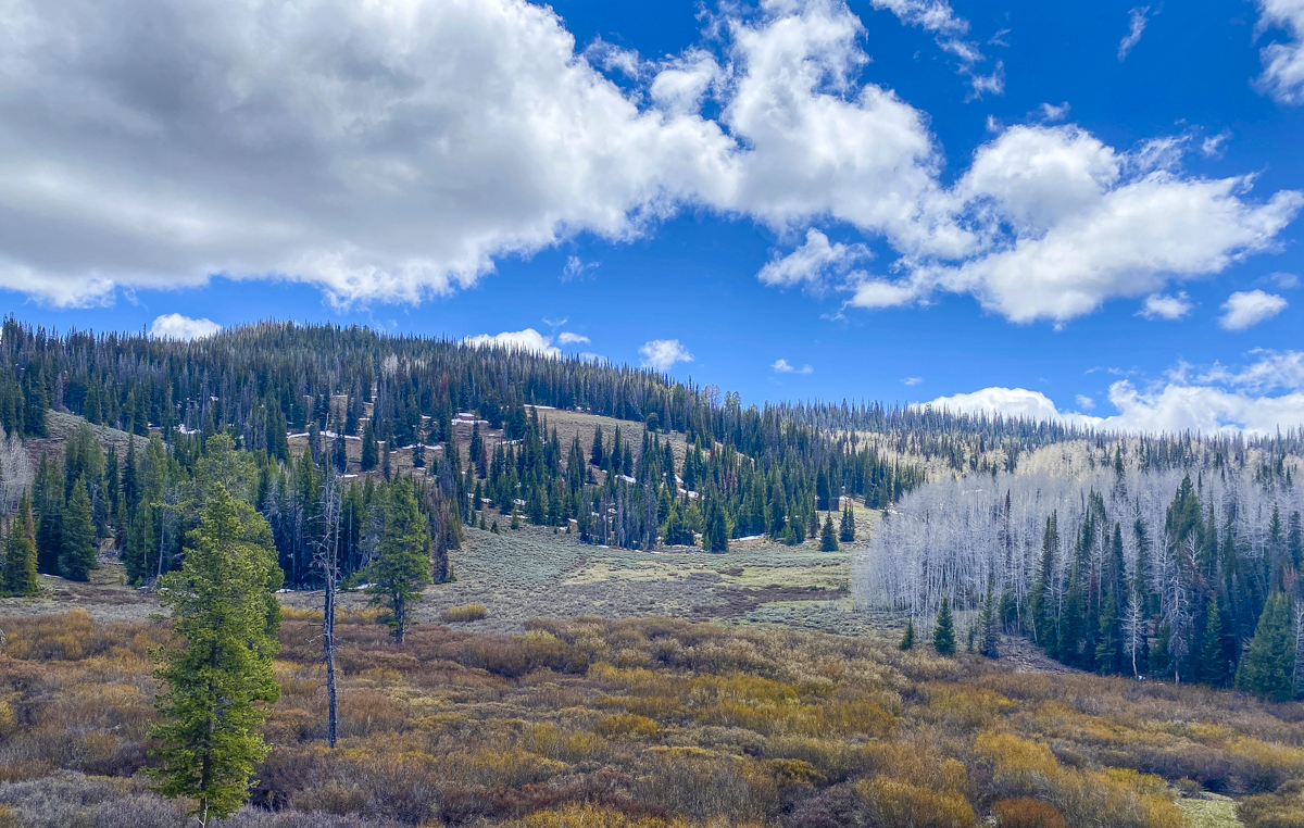 Melissa found some good-looking areas in the nearby Uinta-Wasatch-Cache National Forest, so we headed there the next morning, exploring some high elevation meadows with somewhat muddy roads and scattered pockets of snow, before settling on a lower elevation campsite.