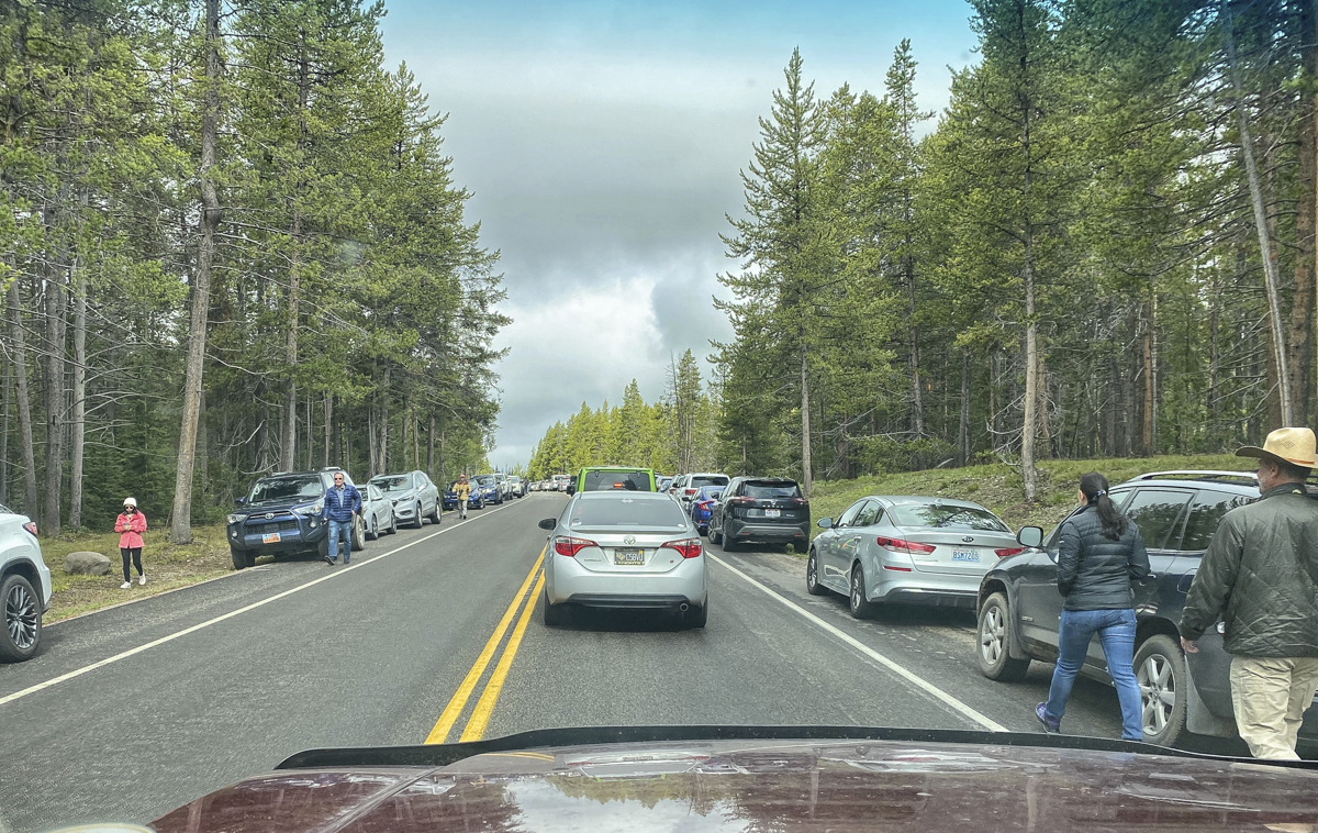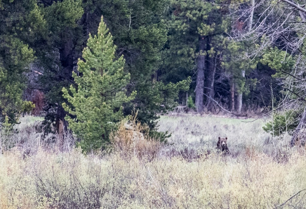 When you see this many cars (the line of parked cars stretched over a quarter of a mile), it is generally for a bear, and this time of year in the Tetons, generally a grizzly. Traffic had come to a stop, so Melissa got out and walked ahead to see if she could see anything. She finally was able to look ahead and saw two sub-adult grizzlies out along the road edge with a crowd of people waaaay too close to them. At that point, a ranger vehicle arrived, turned on its siren while driving toward the bears, and hazed them back into the woods. Rangers then started to attempt to control the crowd (it is often easier to control the bear than the people). I picked up Melissa while our truck crawled through the cars and people. She managed to snap a quick pic of one of the bears (which had walked back out closer to the road) as we drove by under the watchful eyes of two rangers.