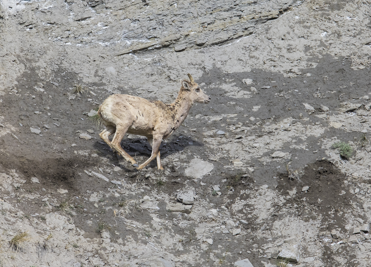 We ended up going into the gateway community of Gardiner to visit with Beth and her family for a little while and to dream of some day living here. On our return to the park, we spotted a group of young bighorn sheep in Gardiner Canyon (a fairly predictable place to see them). A few of the younger sheep started playing and ran across the steep slope, causing dirt and rocks to tumble down. It always amazes me what these gravity-defying mammals can do on these cliffs.