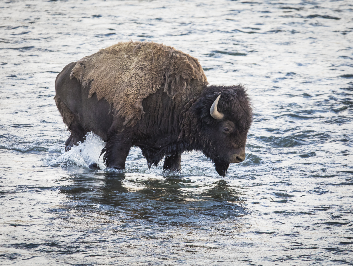 That was a magical moment, just us and the fox out in our favorite place on Earth, with no one else around. A short distance up the road, we watched as a small herd of Bison waded across the creek. I always stop and watch whenever I see these magnificent beasts crossing waterways. This was an easy place to wade across, but there have been times when we have seen them struggle against the swift current of a snow-melt swollen river.